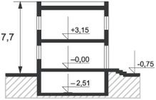 Ściany: 2-warstwowe - pustak ceramiczny. Stropy: żelbetowe, wylewane. Dach: papa - dach płaski, (spadek około 2-3%). Ogrzewanie: gazowe, olejowe.