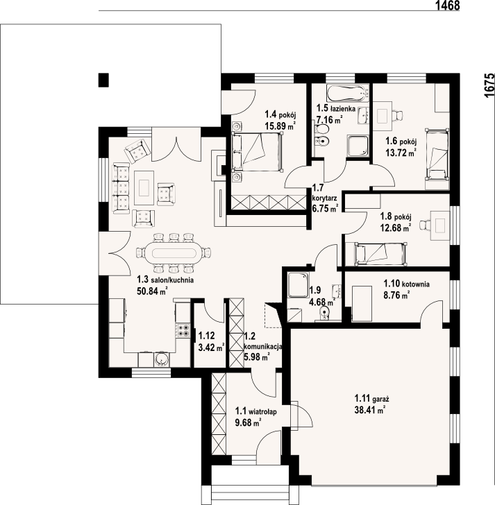 Wysokość ścianki kolankowej: 0.55 m. Strop: płyta żelbetowa. Pokrycie dachu: dachówka ceramiczna Koramic. Ściany zewnętrzne: pustaki ceramiczne Porotherm + styropian. Ściany wewnętrzne: pustaki ceramiczne Porotherm. Typ ogrzewania: kocioł na paliwo stałe. Inne: brama garażowa Hörmann.