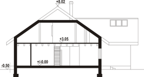 Wysokość ścianki kolankowej: 0.55 m. Strop: płyta żelbetowa. Pokrycie dachu: dachówka ceramiczna Koramic. Ściany zewnętrzne: pustaki ceramiczne Porotherm + styropian. Ściany wewnętrzne: pustaki ceramiczne Porotherm. Typ ogrzewania: kocioł na paliwo stałe. Instalacje dodatkowe: instalacja solarna. Inne: okna połaciowe Fakro, brama garażowa i drzwi Hörmann.