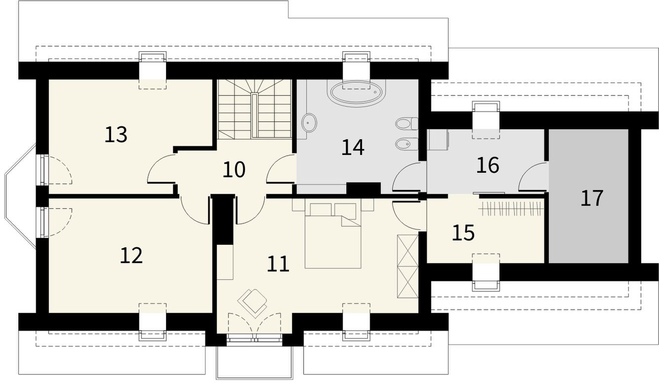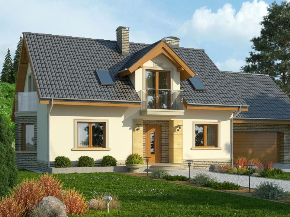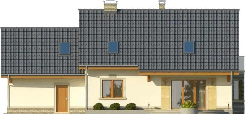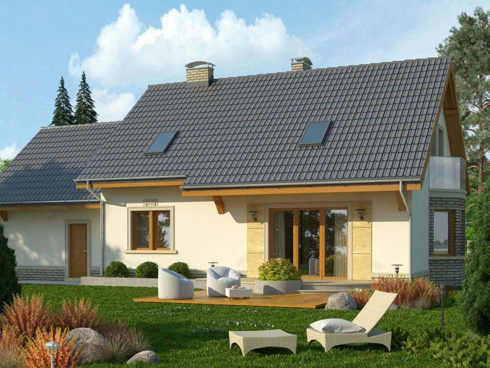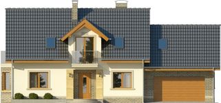 Graficzne opracowanie rzutów poglądowych widocznych na karcie projektu zostało wykonane przez Extradom.pl. Prezentowane przez Extradom.pl wizualizacje wykonane zostały przez autora projektu i należy poczytywać je jedynie za przykład i propozycję wykończenia, wizję architektoniczną autora projektu. Ostateczne wykończenie budynku może nastąpić na wiele sposobów. Szczegółowe rozwiązania zastosowane w oferowanej dokumentacji - w tym również ilość, lokalizacje i wygląd okien, drzwi, kominów - mogą w niewielkim stopniu różnić się od prezentowanej wizualizacji budynku.