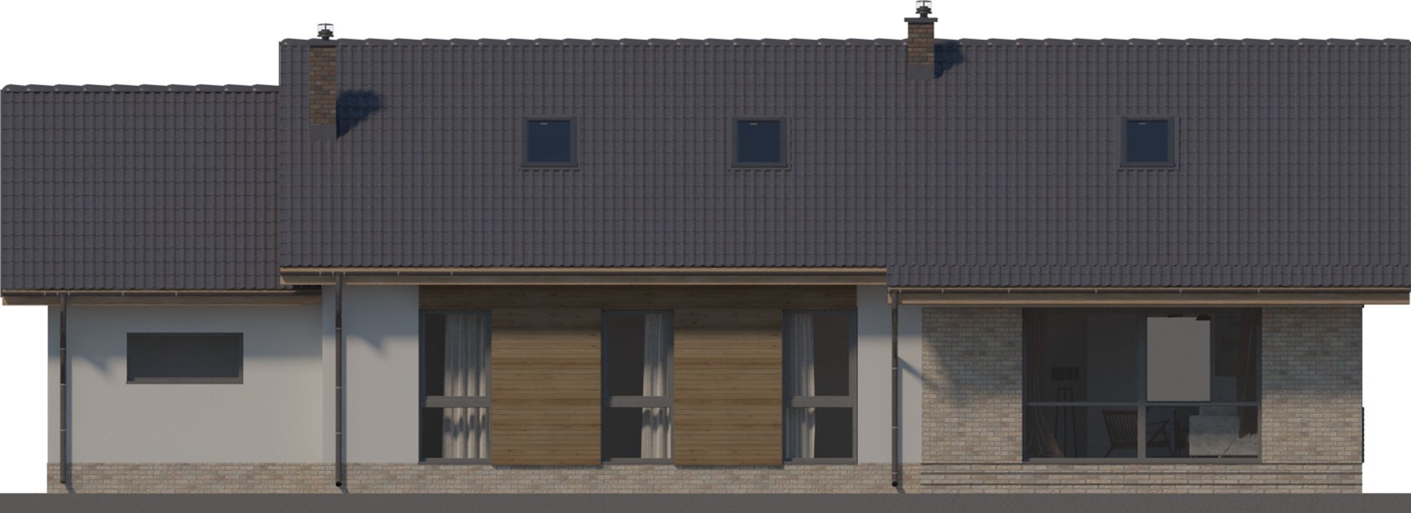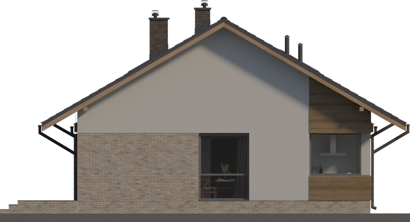 Graficzne opracowanie rzutów poglądowych widocznych na karcie projektu zostało wykonane przez Extradom.pl. Prezentowane przez Extradom.pl wizualizacje wykonane zostały przez autora projektu i należy poczytywać je jedynie za przykład i propozycję wykończenia, wizję architektoniczną autora projektu. Ostateczne wykończenie budynku może nastąpić na wiele sposobów. Szczegółowe rozwiązania zastosowane w oferowanej dokumentacji - w tym również ilość, lokalizacje i wygląd okien, drzwi, kominów - mogą w niewielkim stopniu różnić się od prezentowanej wizualizacji budynku.