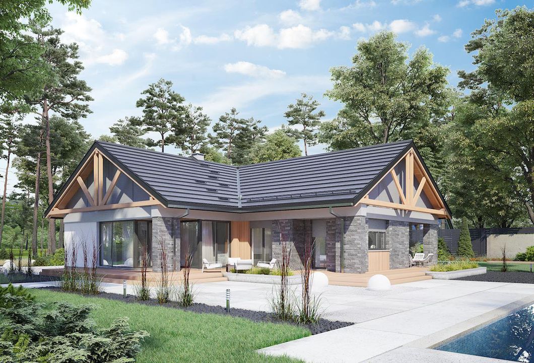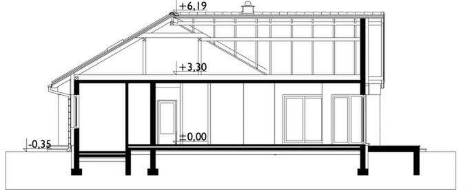 Graficzne opracowanie rzutów poglądowych widocznych na karcie projektu zostało wykonane przez Extradom.pl. Prezentowane przez Extradom.pl wizualizacje wykonane zostały przez autora projektu i należy poczytywać je jedynie za przykład i propozycję wykończenia, wizję architektoniczną autora projektu. Ostateczne wykończenie budynku może nastąpić na wiele sposobów. Szczegółowe rozwiązania zastosowane w oferowanej dokumentacji - w tym również ilość, lokalizacje i wygląd okien, drzwi, kominów - mogą w niewielkim stopniu różnić się od prezentowanej wizualizacji budynku.