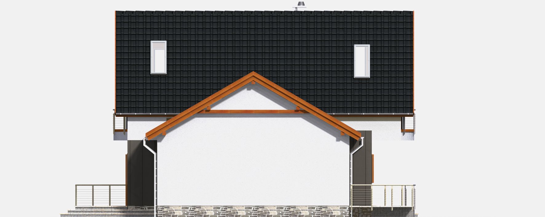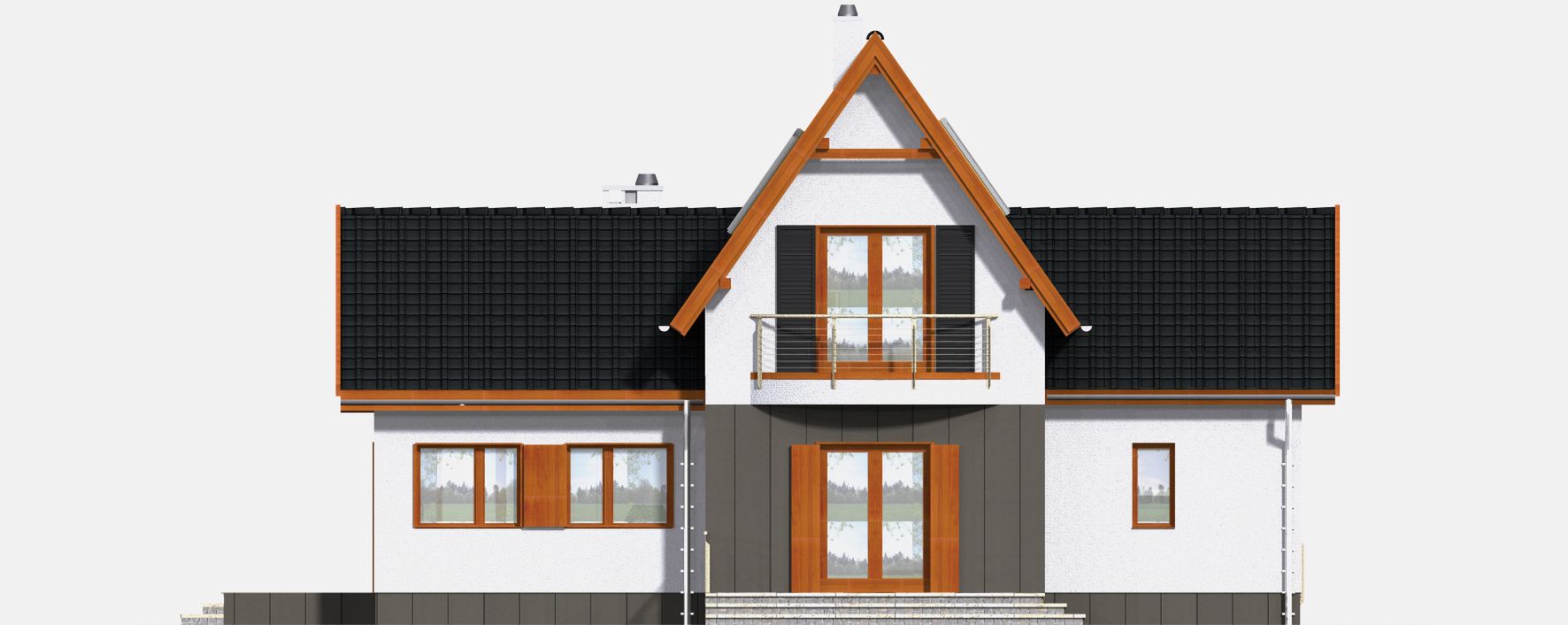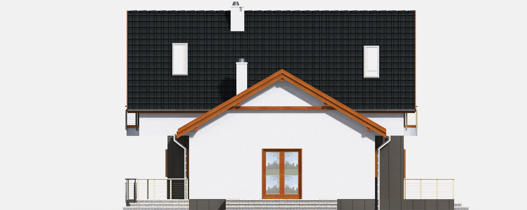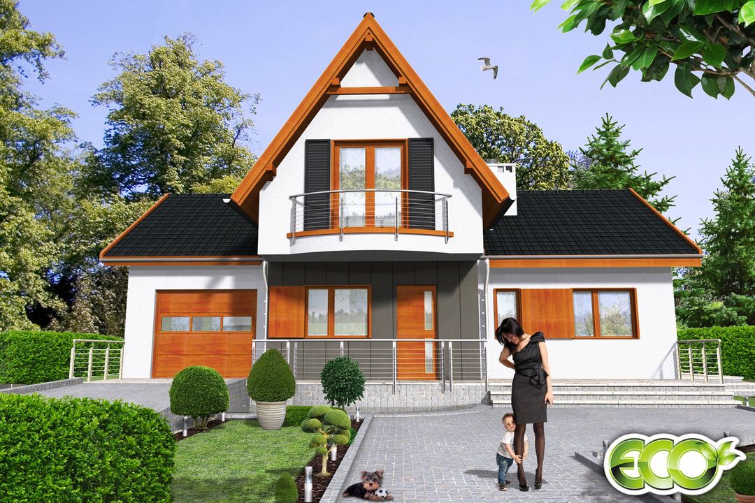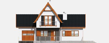 Graficzne opracowanie rzutów poglądowych widocznych na karcie projektu zostało wykonane przez Extradom.pl. Prezentowane przez Extradom.pl wizualizacje wykonane zostały przez autora projektu i należy poczytywać je jedynie za przykład i propozycję wykończenia, wizję architektoniczną autora projektu. Ostateczne wykończenie budynku może nastąpić na wiele sposobów. Szczegółowe rozwiązania zastosowane w oferowanej dokumentacji - w tym również ilość, lokalizacje i wygląd okien, drzwi, kominów - mogą w niewielkim stopniu różnić się od prezentowanej wizualizacji budynku.