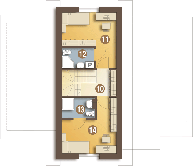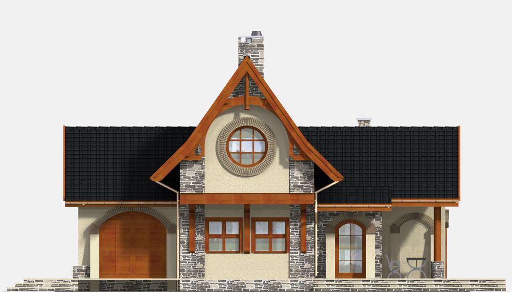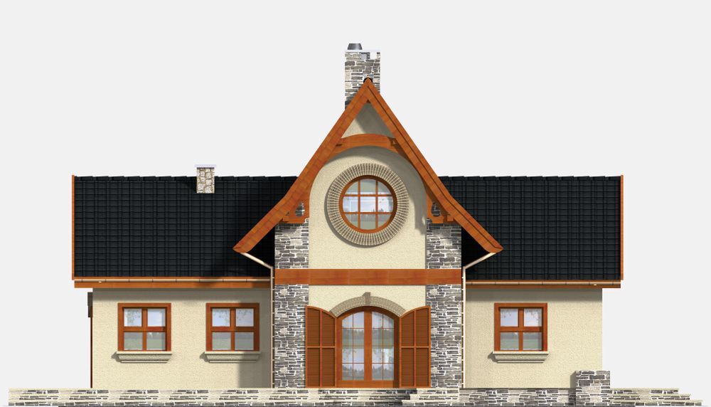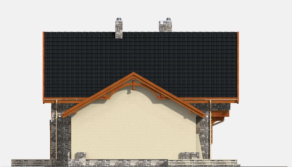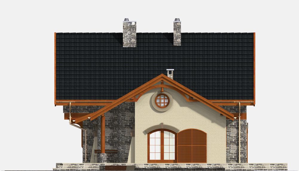 Graficzne opracowanie rzutów poglądowych widocznych na karcie projektu zostało wykonane przez Extradom.pl. Prezentowane przez Extradom.pl wizualizacje wykonane zostały przez autora projektu i należy poczytywać je jedynie za przykład i propozycję wykończenia, wizję architektoniczną autora projektu. Ostateczne wykończenie budynku może nastąpić na wiele sposobów. Szczegółowe rozwiązania zastosowane w oferowanej dokumentacji - w tym również ilość, lokalizacje i wygląd okien, drzwi, kominów - mogą w niewielkim stopniu różnić się od prezentowanej wizualizacji budynku.