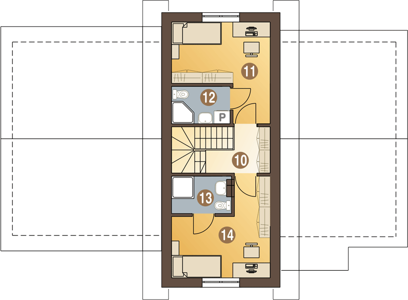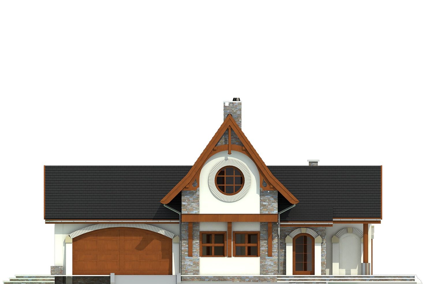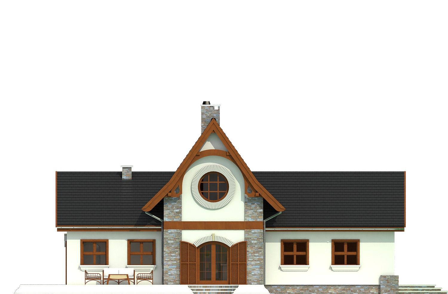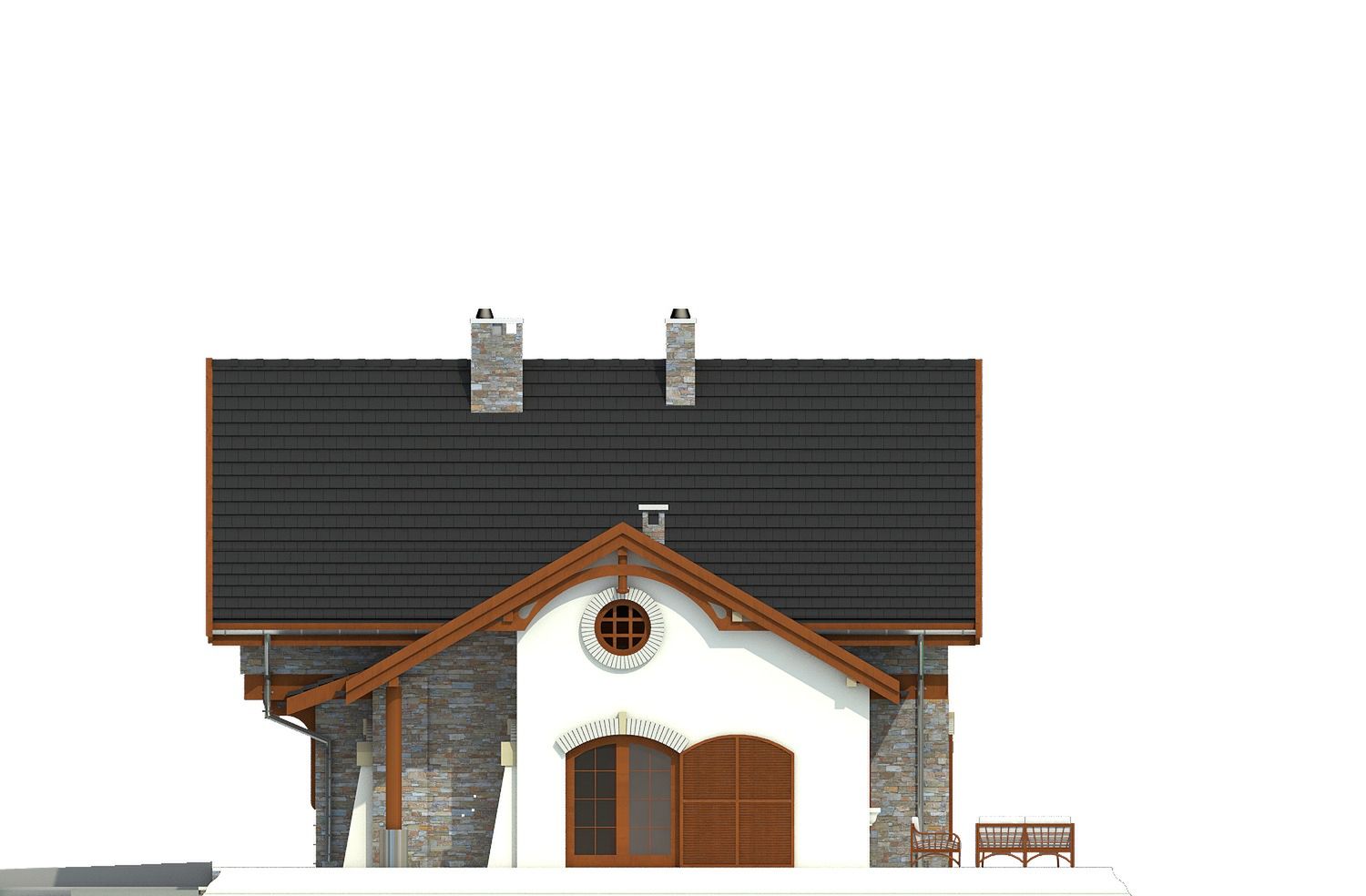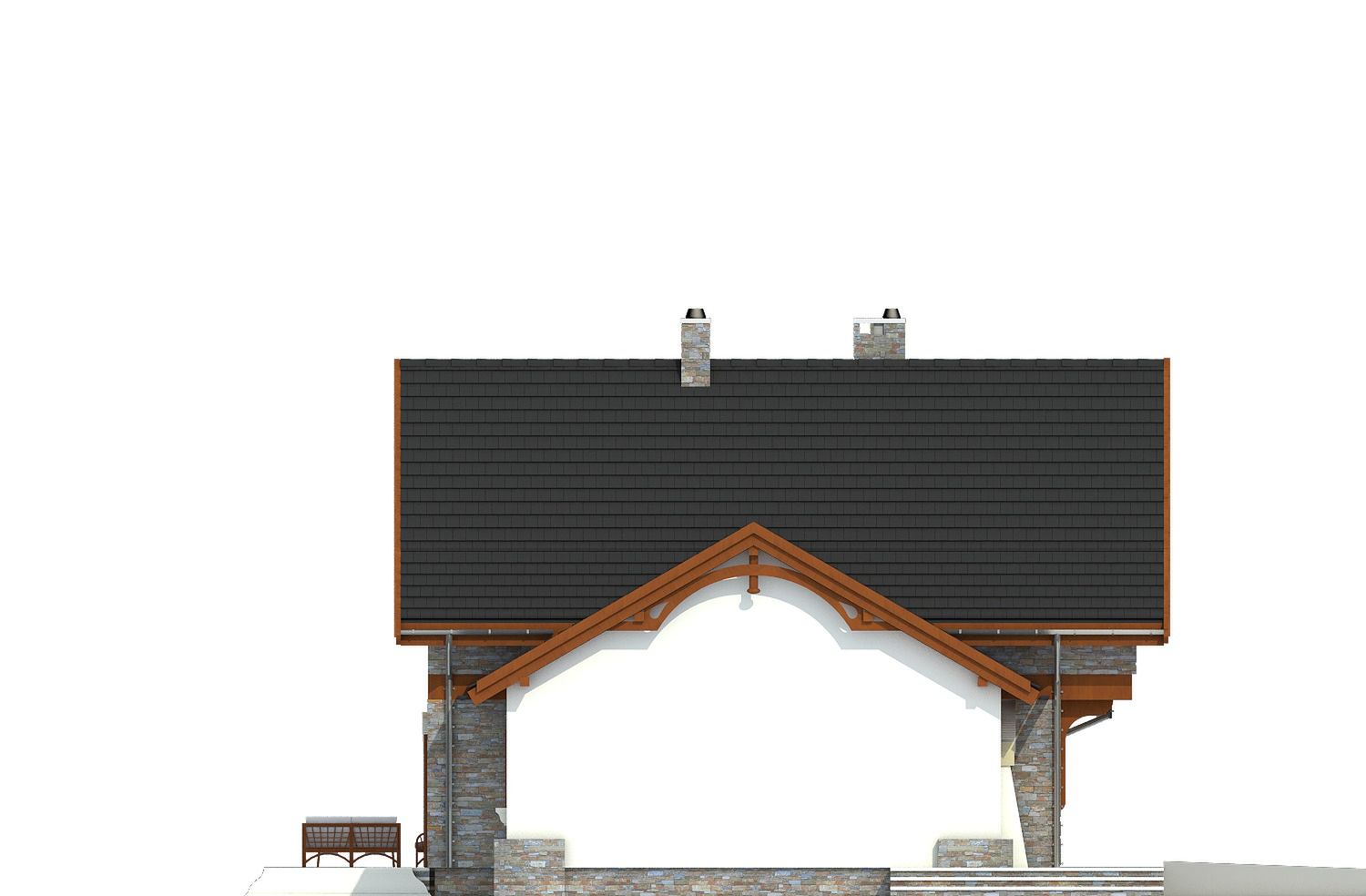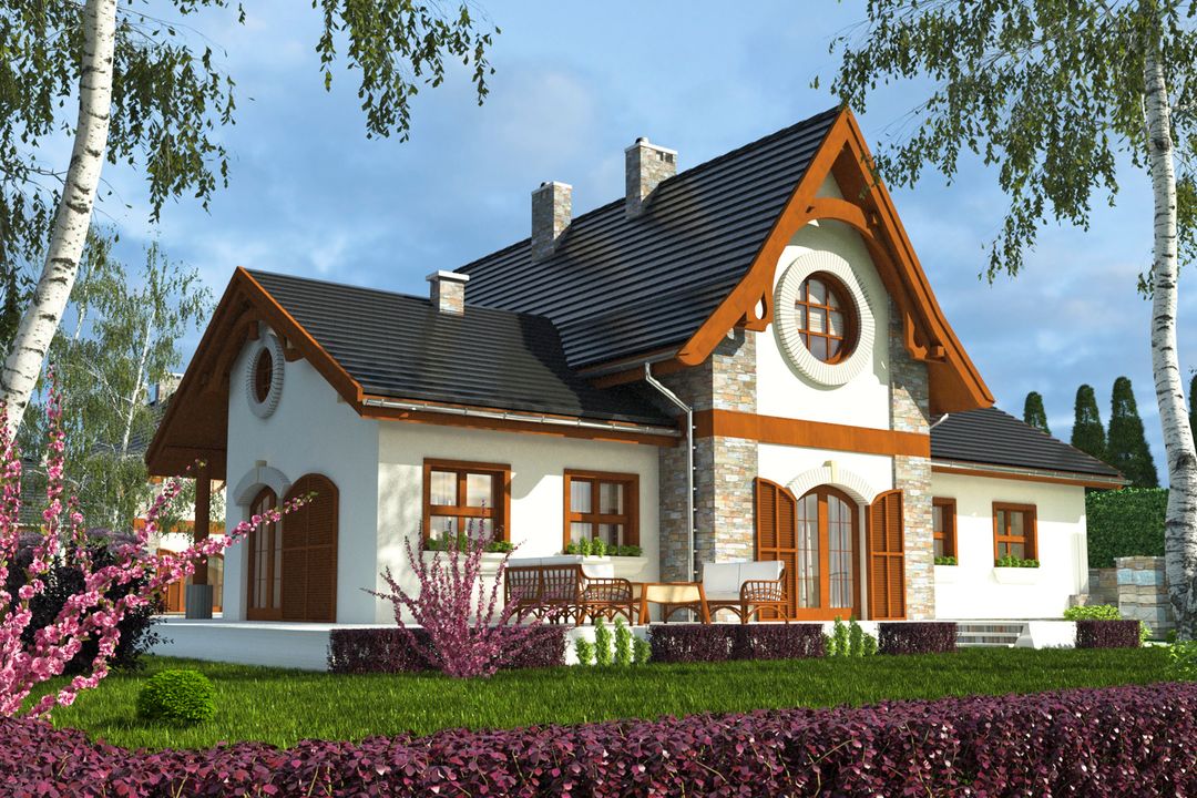 Graficzne opracowanie rzutów poglądowych widocznych na karcie projektu zostało wykonane przez Extradom.pl. Prezentowane przez Extradom.pl wizualizacje wykonane zostały przez autora projektu i należy poczytywać je jedynie za przykład i propozycję wykończenia, wizję architektoniczną autora projektu. Ostateczne wykończenie budynku może nastąpić na wiele sposobów. Szczegółowe rozwiązania zastosowane w oferowanej dokumentacji - w tym również ilość, lokalizacje i wygląd okien, drzwi, kominów - mogą w niewielkim stopniu różnić się od prezentowanej wizualizacji budynku.