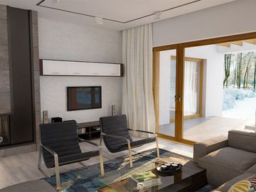 Graficzne opracowanie rzutów poglądowych widocznych na karcie projektu zostało wykonane przez Extradom.pl. Prezentowane przez Extradom.pl wizualizacje wykonane zostały przez autora projektu i należy poczytywać je jedynie za przykład i propozycję wykończenia, wizję architektoniczną autora projektu. Ostateczne wykończenie budynku może nastąpić na wiele sposobów. Szczegółowe rozwiązania zastosowane w oferowanej dokumentacji - w tym również ilość, lokalizacje i wygląd okien, drzwi, kominów - mogą w niewielkim stopniu różnić się od prezentowanej wizualizacji budynku.
