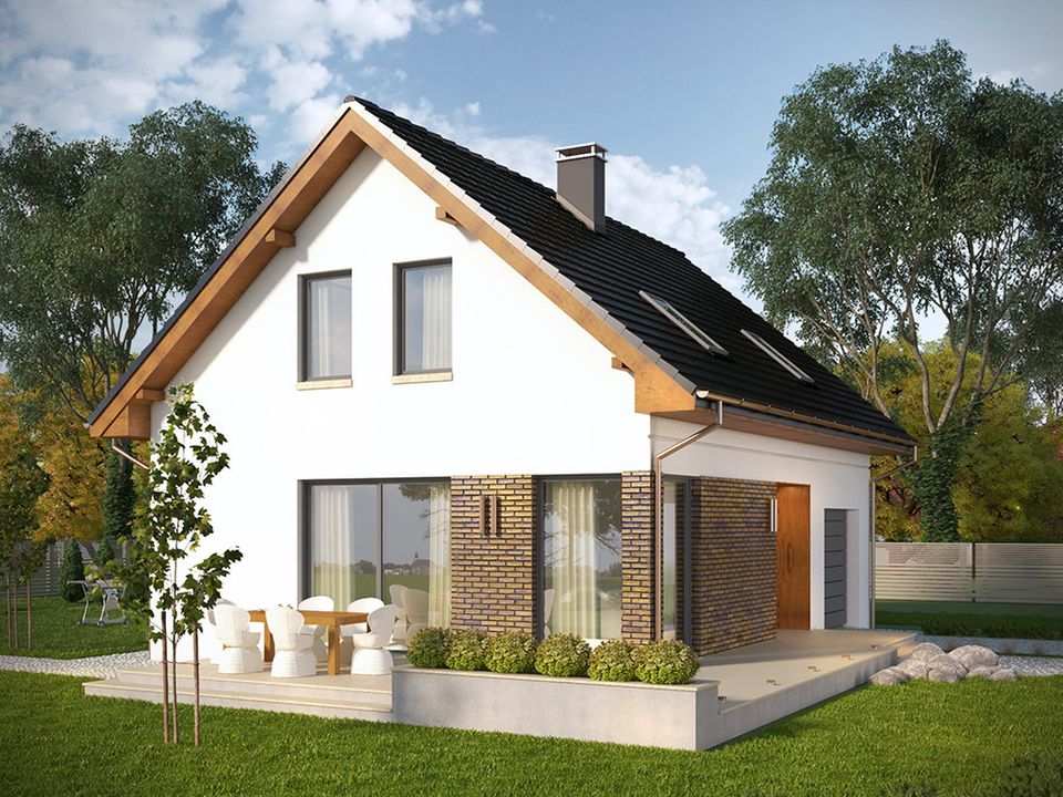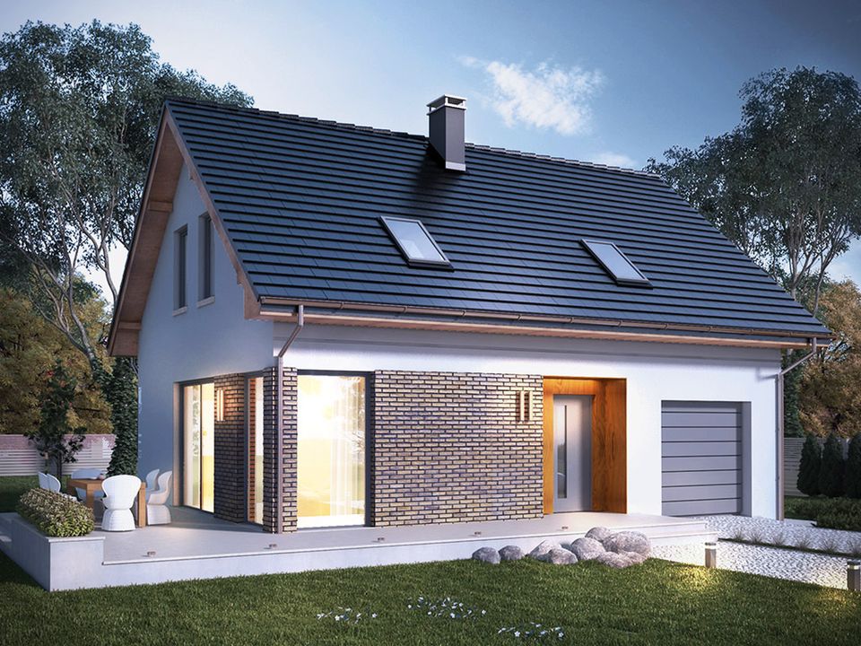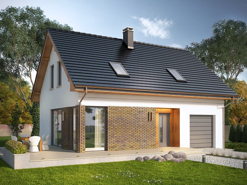 Graficzne opracowanie rzutów poglądowych widocznych na karcie projektu zostało wykonane przez Extradom.pl. Prezentowane przez Extradom.pl wizualizacje wykonane zostały przez autora projektu i należy poczytywać je jedynie za przykład i propozycję wykończenia, wizję architektoniczną autora projektu. Ostateczne wykończenie budynku może nastąpić na wiele sposobów. Szczegółowe rozwiązania zastosowane w oferowanej dokumentacji - w tym również ilość, lokalizacje i wygląd okien, drzwi, kominów - mogą w niewielkim stopniu różnić się od prezentowanej wizualizacji budynku.