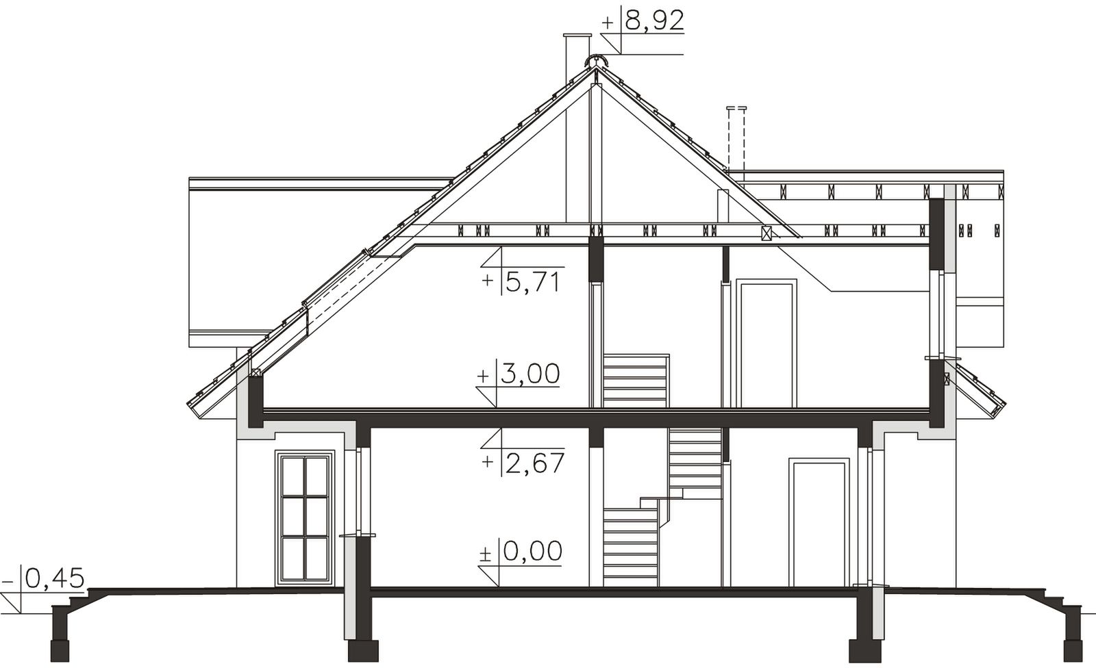 Fundamenty - rozwiązanie o podwyższonej izolacji termicznej. Ściany zewnętrzne - Bloczek silikatowy 24 cm + styropian 20 cm. Strop - gęstożebrowy. Dach - tradycyjna więźba ciesielska. Ogrzewanie - c.o. grzejnikowe + c.w.u. - kocioł gazowy. Wentylacja - rekuperacja.