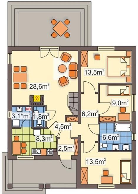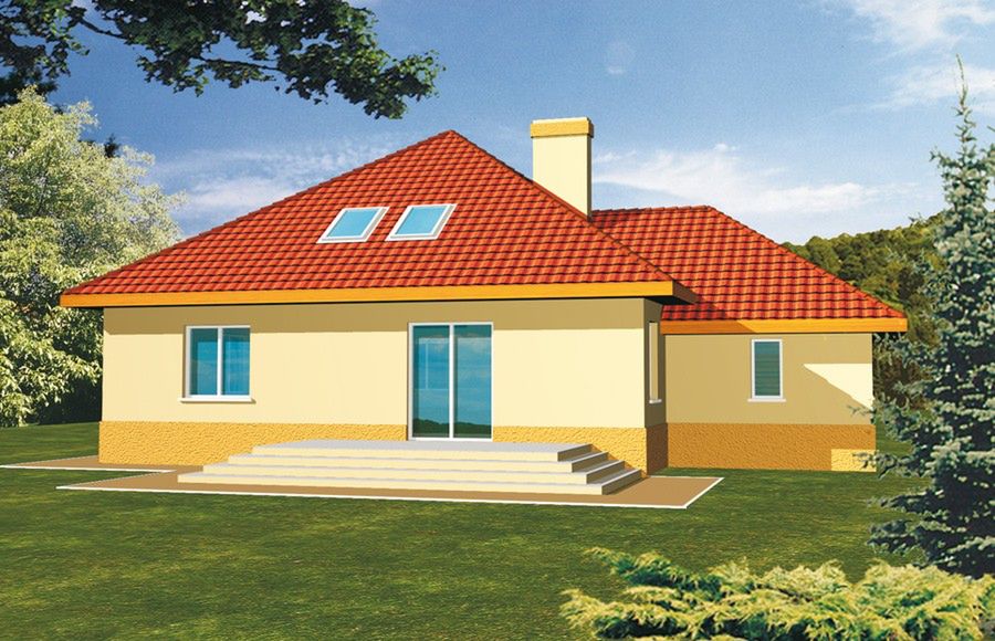 Graficzne opracowanie rzutów poglądowych widocznych na karcie projektu zostało wykonane przez Extradom.pl. Prezentowane przez Extradom.pl wizualizacje wykonane zostały przez autora projektu i należy poczytywać je jedynie za przykład i propozycję wykończenia, wizję architektoniczną autora projektu. Ostateczne wykończenie budynku może nastąpić na wiele sposobów. Szczegółowe rozwiązania zastosowane w oferowanej dokumentacji - w tym również ilość, lokalizacje i wygląd okien, drzwi, kominów - mogą w niewielkim stopniu różnić się od prezentowanej wizualizacji budynku.