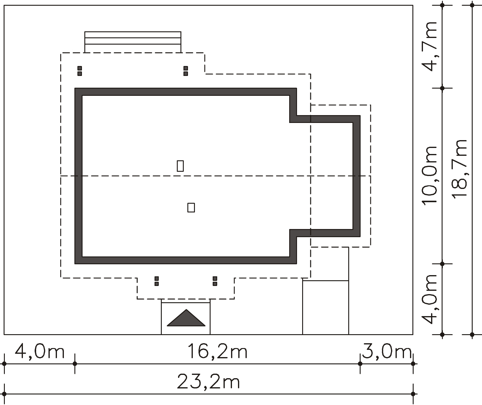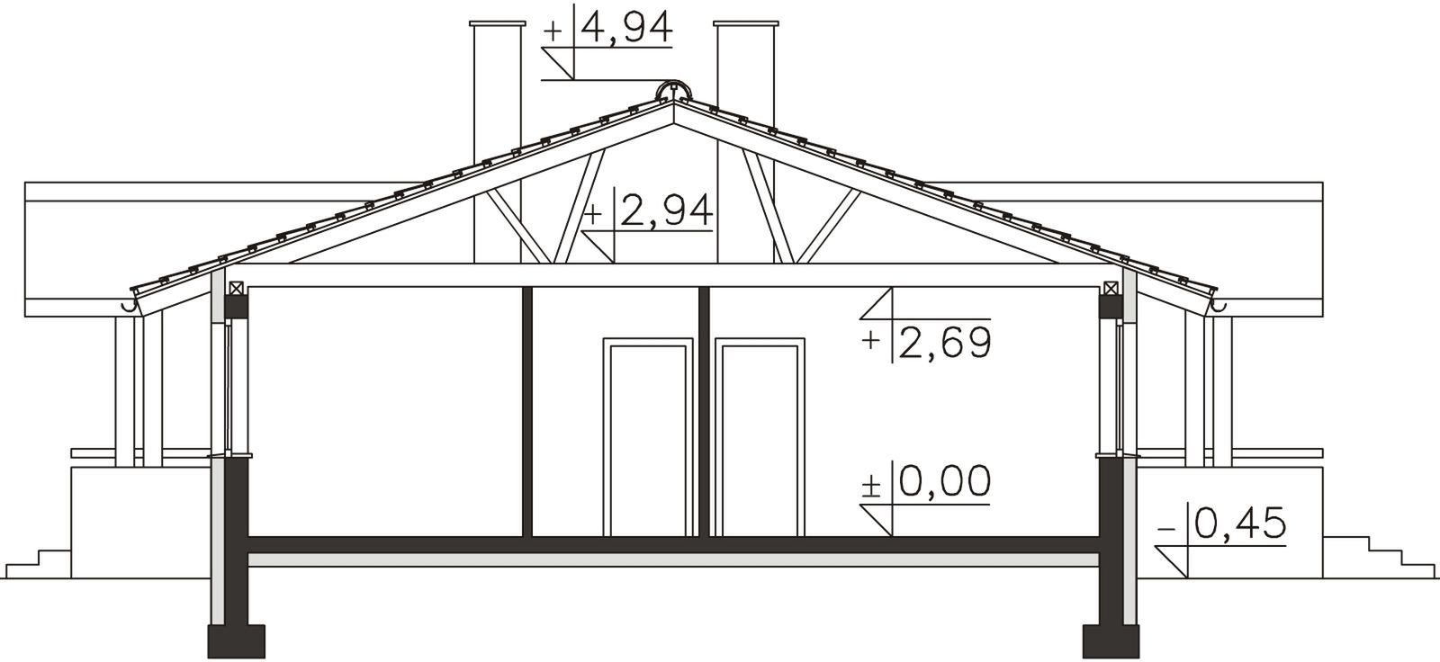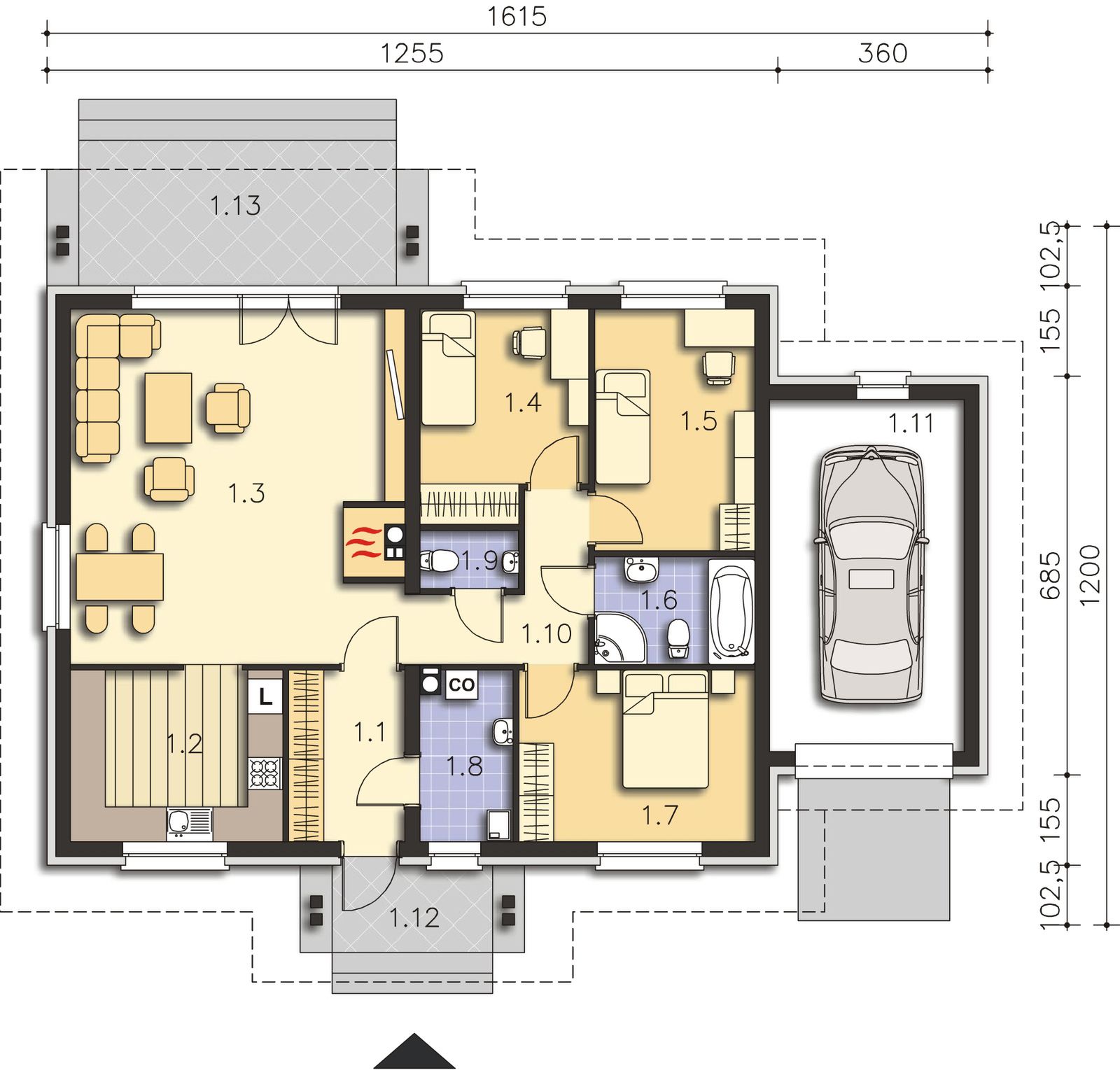 Graficzne opracowanie rzutów poglądowych widocznych na karcie projektu zostało wykonane przez Extradom.pl. Prezentowane przez Extradom.pl wizualizacje wykonane zostały przez autora projektu i należy poczytywać je jedynie za przykład i propozycję wykończenia, wizję architektoniczną autora projektu. Ostateczne wykończenie budynku może nastąpić na wiele sposobów. Szczegółowe rozwiązania zastosowane w oferowanej dokumentacji - w tym również ilość, lokalizacje i wygląd okien, drzwi, kominów - mogą w niewielkim stopniu różnić się od prezentowanej wizualizacji budynku.