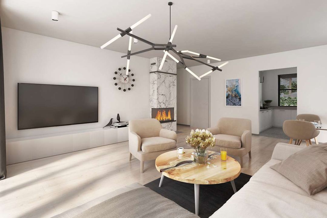 Graficzne opracowanie rzutów poglądowych widocznych na karcie projektu zostało wykonane przez Extradom.pl. Prezentowane przez Extradom.pl wizualizacje wykonane zostały przez autora projektu i należy poczytywać je jedynie za przykład i propozycję wykończenia, wizję architektoniczną autora projektu. Ostateczne wykończenie budynku może nastąpić na wiele sposobów. Szczegółowe rozwiązania zastosowane w oferowanej dokumentacji - w tym również ilość, lokalizacje i wygląd okien, drzwi, kominów - mogą w niewielkim stopniu różnić się od prezentowanej wizualizacji budynku.