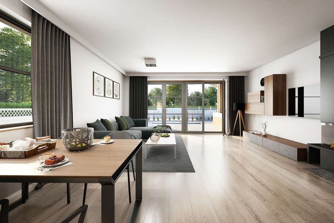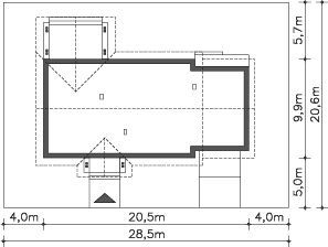 Graficzne opracowanie rzutów poglądowych widocznych na karcie projektu zostało wykonane przez Extradom.pl. Prezentowane przez Extradom.pl wizualizacje wykonane zostały przez autora projektu i należy poczytywać je jedynie za przykład i propozycję wykończenia, wizję architektoniczną autora projektu. Ostateczne wykończenie budynku może nastąpić na wiele sposobów. Szczegółowe rozwiązania zastosowane w oferowanej dokumentacji - w tym również ilość, lokalizacje i wygląd okien, drzwi, kominów - mogą w niewielkim stopniu różnić się od prezentowanej wizualizacji budynku.
