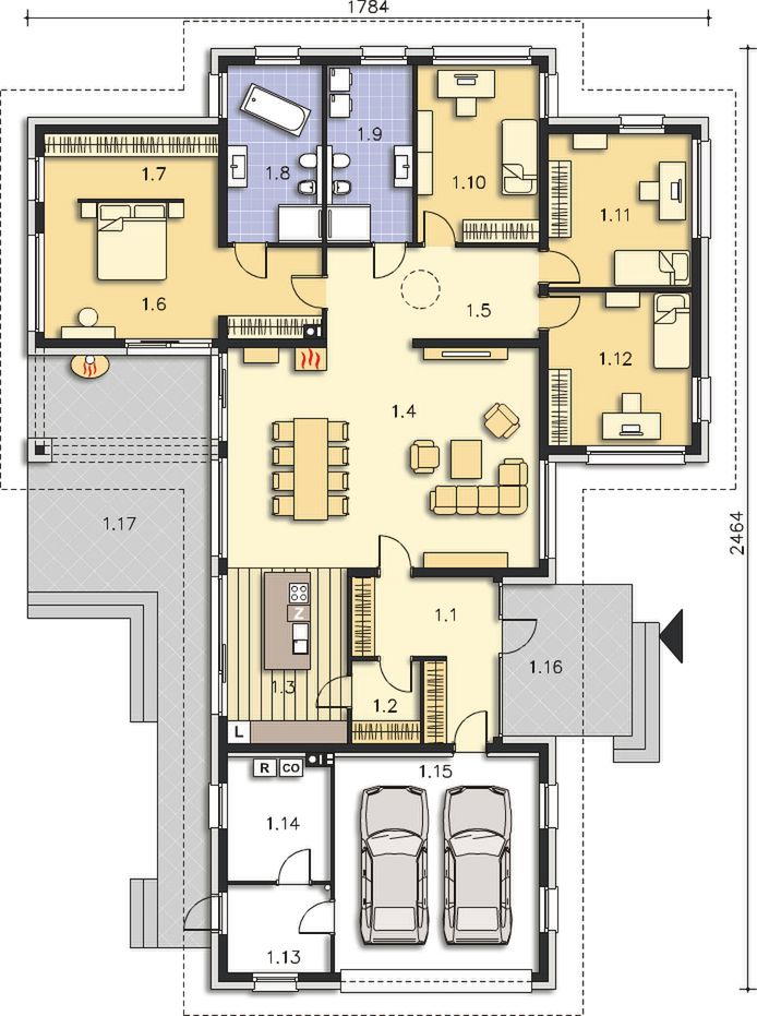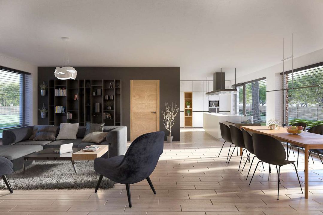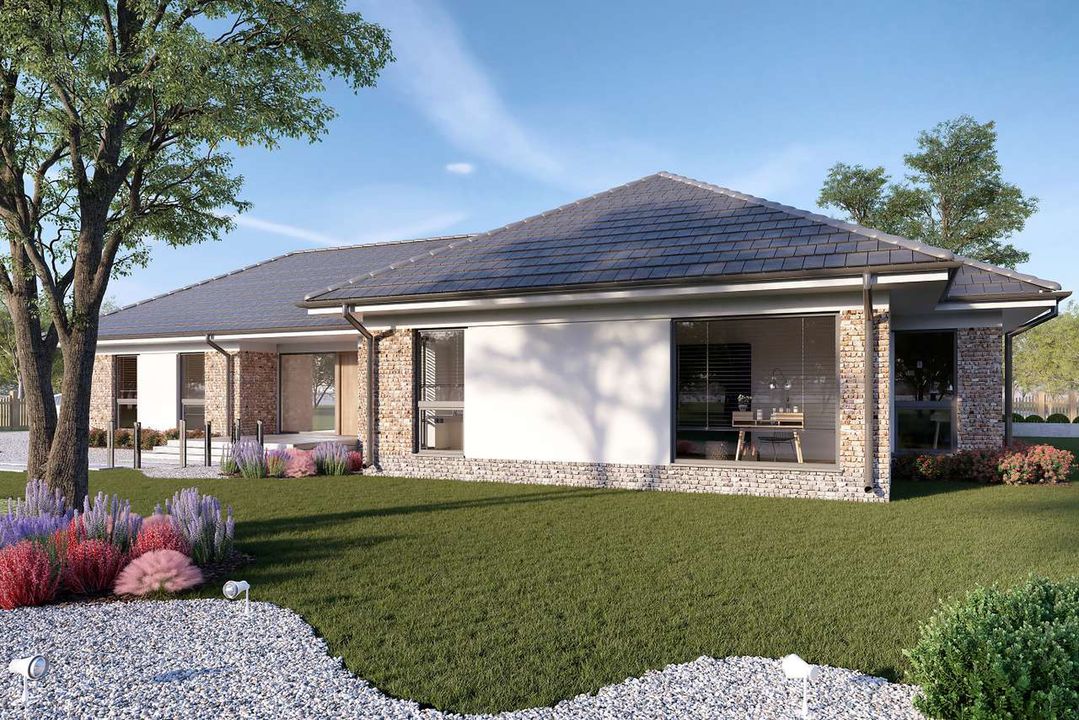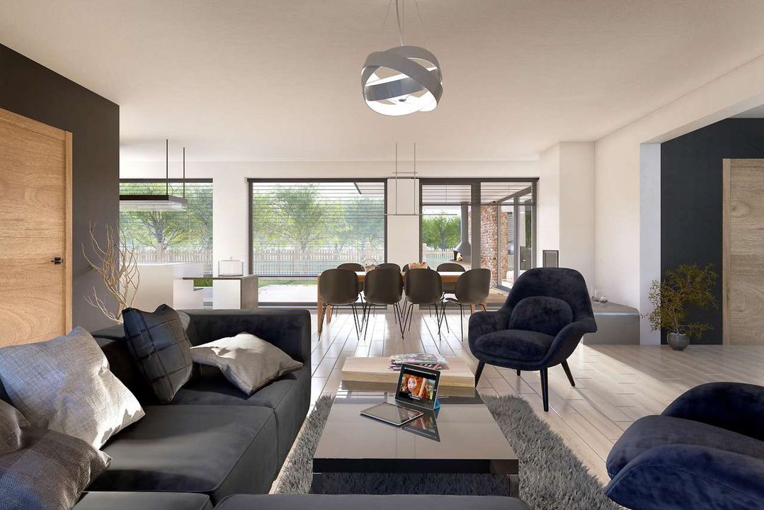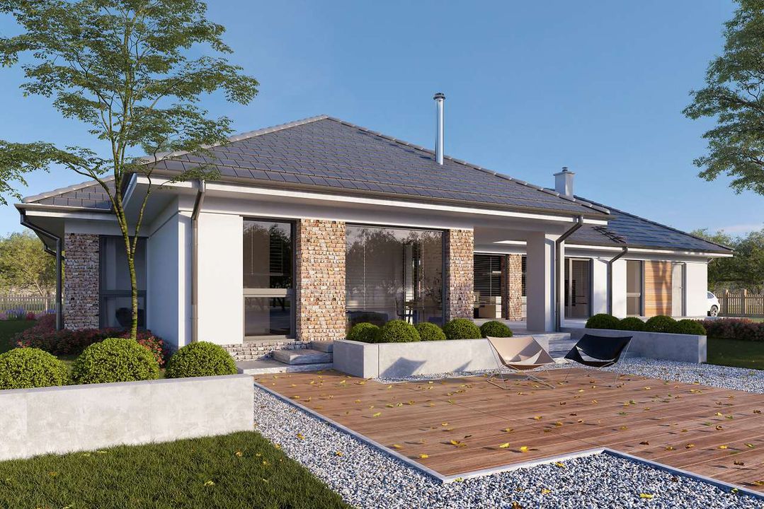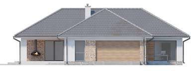 Graficzne opracowanie rzutów poglądowych widocznych na karcie projektu zostało wykonane przez Extradom.pl. Prezentowane przez Extradom.pl wizualizacje wykonane zostały przez autora projektu i należy poczytywać je jedynie za przykład i propozycję wykończenia, wizję architektoniczną autora projektu. Ostateczne wykończenie budynku może nastąpić na wiele sposobów. Szczegółowe rozwiązania zastosowane w oferowanej dokumentacji - w tym również ilość, lokalizacje i wygląd okien, drzwi, kominów - mogą w niewielkim stopniu różnić się od prezentowanej wizualizacji budynku.