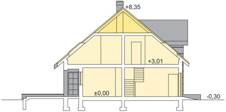 Strop: gęstożebrowy Teriva I. Ściany zewnętrzne: gazobeton 24cm + styropian Termonium Fasada 12cm. Pokrycie dachowe: dachówka ceramiczna.
