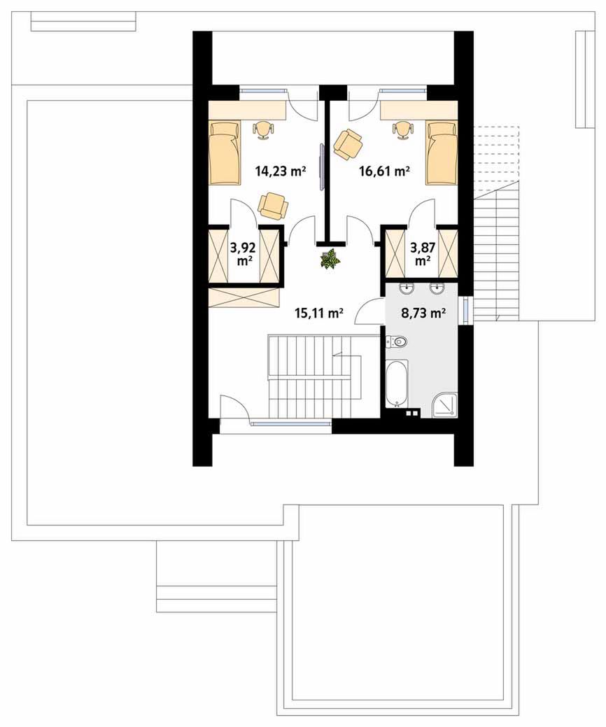 Graficzne opracowanie rzutów poglądowych widocznych na karcie projektu zostało wykonane przez Extradom.pl. Prezentowane przez Extradom.pl wizualizacje wykonane zostały przez autora projektu i należy poczytywać je jedynie za przykład i propozycję wykończenia, wizję architektoniczną autora projektu. Ostateczne wykończenie budynku może nastąpić na wiele sposobów. Szczegółowe rozwiązania zastosowane w oferowanej dokumentacji - w tym również ilość, lokalizacje i wygląd okien, drzwi, kominów - mogą w niewielkim stopniu różnić się od prezentowanej wizualizacji budynku.