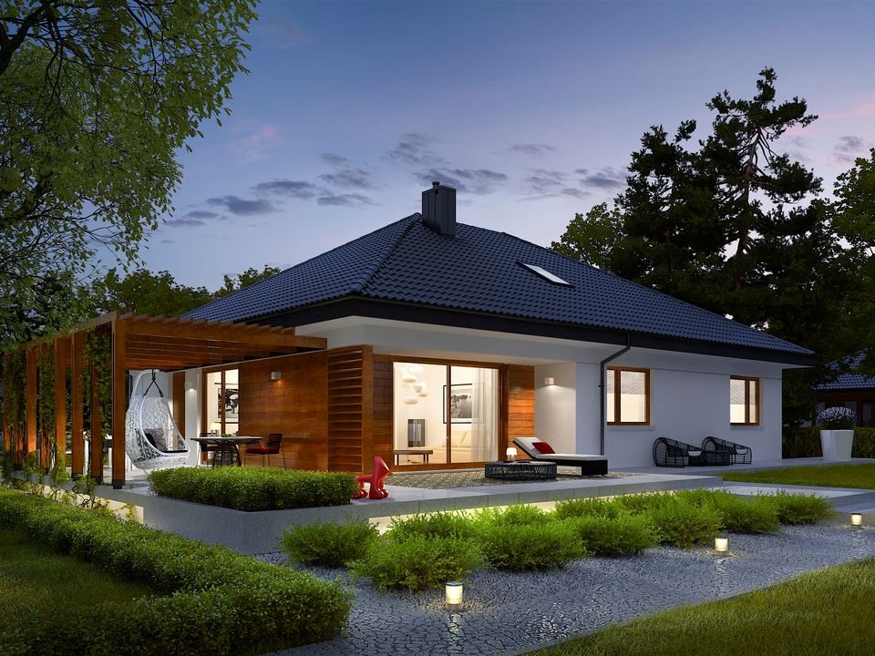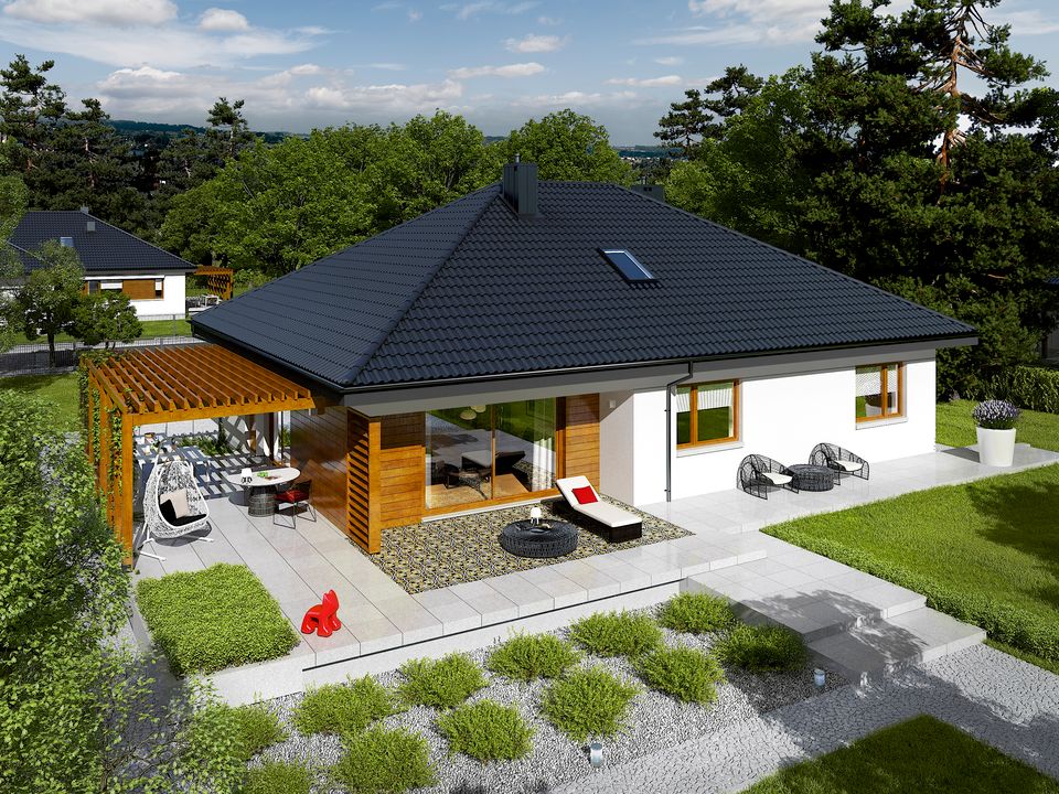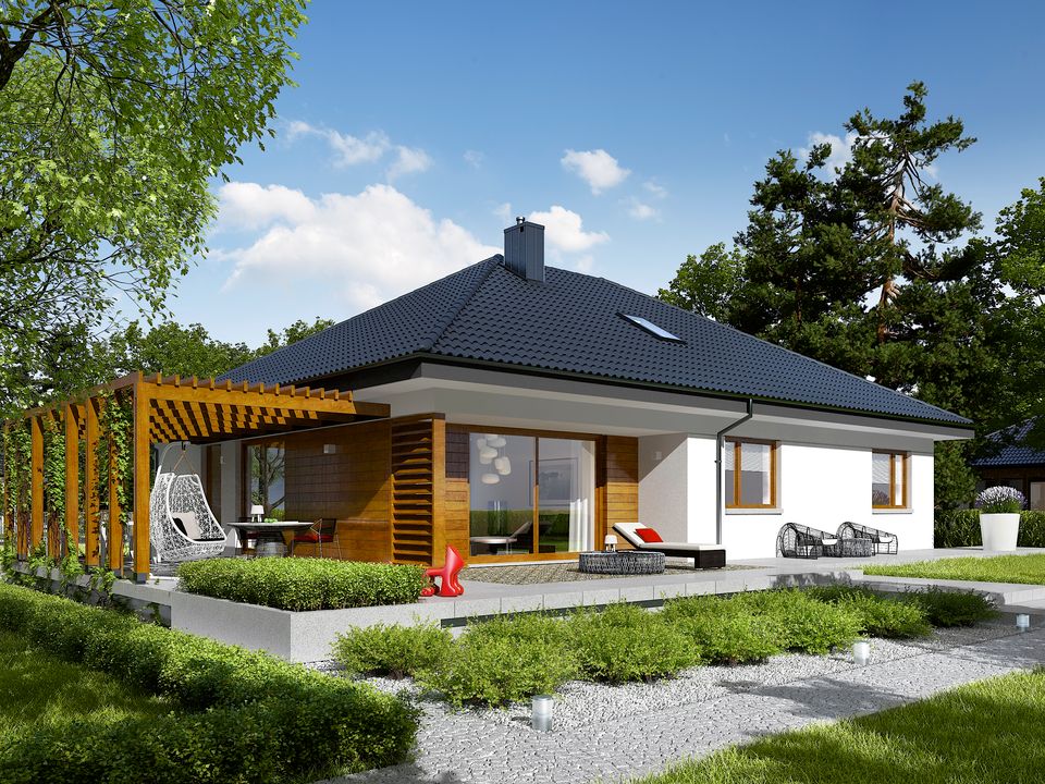 Fundamenty: ławy, bloczki betonowe 24 cm, ocieplenie styropian 15 cm. Ściany zewnętrzne: murowane, dwuwarstwowe, pustaki z ceramiki poryzowanej 24 cm, ocieplenie 20 cm. Ściany wewnętrzne: murowane, pustaki z ceramiki poryzowanej, ściany nośne 24 cm, ścianki działowe 11,5 cm. Podłoga na gruncie: płyta betonowa, ocieplenie styropian 15 cm. Strop: strop gęstożebrowy Teriva, ocieplenie wełna mineralna 30 cm. Dach: konstrukcja drewniana, dachówka ceramiczna Röben, w przypadku wykorzystania poddasza jako mieszkalne – ocieplenie dachu: wełna mineralna 30 cm, więźba dachowa dostępna również w systemie prefabrykacji drewnianej. Inne: schody wewnętrzne drewnianeRozwiązania instalacje. Ogrzewanie: kocioł gazowy, rozprowadzenie ciepła: grzejniki. Wentylacja: grawitacyjna. Elewacje: tynk cienkowarstwowy mineralny i okładzina z płyty HPL z naturalną okleiną drewnianą firmy Prodema. Stolarka: drewniana, PCV lub aluminiowa, drzwi wejściowe i brama garażowa firmy Hörmann. Okna połaciowe: rozwiązania technologiczne firmy FAKRO, wyłaz dachowy FAKROInne: pergola drewniana. Otoczenie: system tarasowy ProDeck - deska kompozytowa Terra w kolorze platyna.
