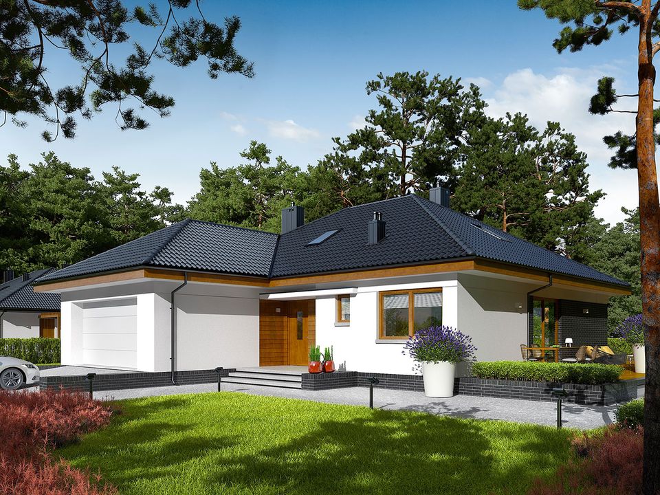 Fundamenty: ławy, bloczki betonowe 24 cm, ocieplenie styropian 15 cm. Ściany zewnętrzne: murowane, dwuwarstwowe, bloczki betonu komórkowego firmy H+H 24 cm, ocieplenie 20 cm. Ściany wewnętrzne: murowane, bloczki betonu komórkowego firmy H+H, ściany nośne 24 cm, ścianki działowe 11,5 cm. Podłoga na gruncie: płyta betonowa, ocieplenie styropian 15 cm. Strop: strop gęstożebrowy Teriva, ocieplenie wełna mineralna 30 cm. Dach: konstrukcja drewniana, dachówka ceramiczna płaska Bergamo firmy Röben, w przypadku wykorzystania poddasza jako mieszkalne – ocieplenie dachu: wełna mineralna 30 cm, więźba dachowa dostępna również w systemie prefabrykacji drewnianej. Inne: schody wewnętrzne drewniane Rozwiązania instalacje. Ogrzewanie: kocioł gazowy, rozprowadzenie ciepła: grzejniki. Wentylacja: grawitacyjna. Elewacje: tynk cienkowarstwowy mineralny, okładzina klinkierowa Röben i okładzina z płyty HPL z naturalną okleiną drewnianą firmy Prodema. Stolarka: drewniana, PVC lub aluminiowa, drzwi wejściowe i brama garażowa firmy Hörmann. Okna połaciowe: w przypadku wykorzystania poddasza jako mieszkalne – rozwiązania technologiczne firmy FAKRO, wyłaz dachowy FAKRO. Otoczenie: system tarasowy ProDeck - deska kompozytowa Terra w kolorze złoty dąb.