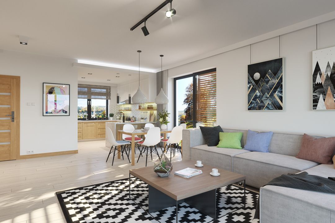 Graficzne opracowanie rzutów poglądowych widocznych na karcie projektu zostało wykonane przez Extradom.pl. Prezentowane przez Extradom.pl wizualizacje wykonane zostały przez autora projektu i należy poczytywać je jedynie za przykład i propozycję wykończenia, wizję architektoniczną autora projektu. Ostateczne wykończenie budynku może nastąpić na wiele sposobów. Szczegółowe rozwiązania zastosowane w oferowanej dokumentacji - w tym również ilość, lokalizacje i wygląd okien, drzwi, kominów - mogą w niewielkim stopniu różnić się od prezentowanej wizualizacji budynku.