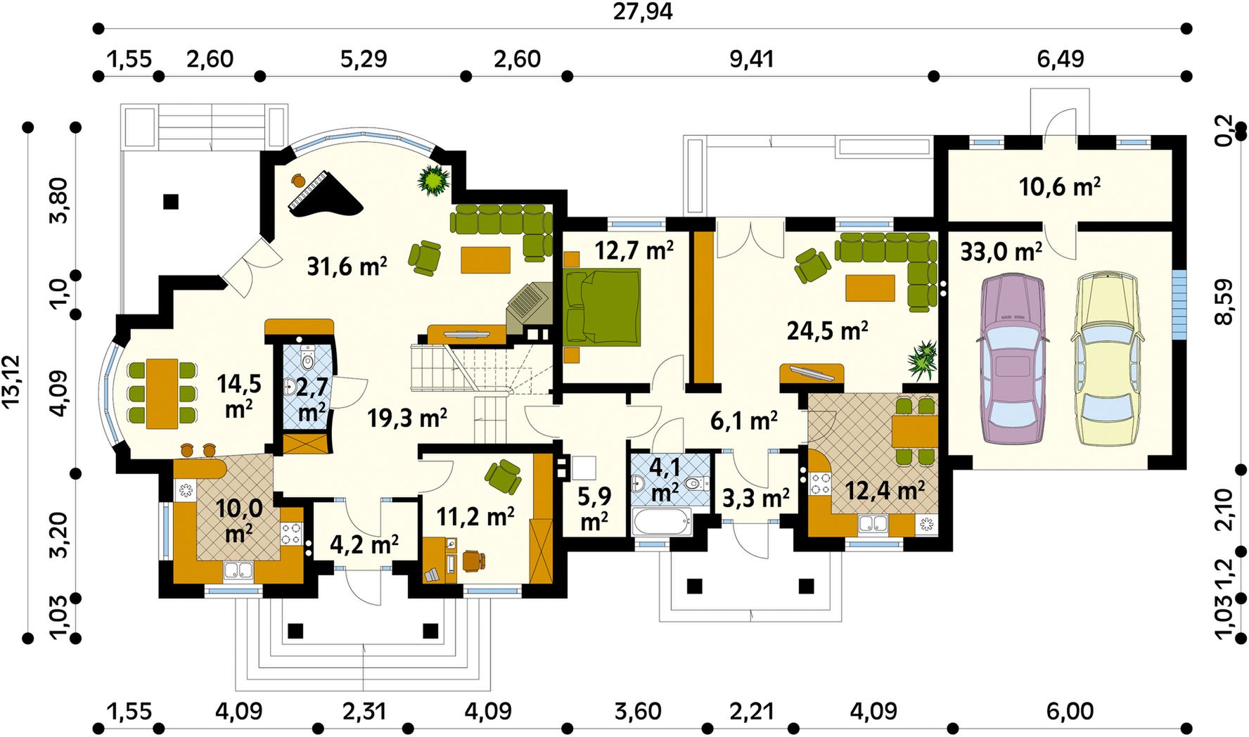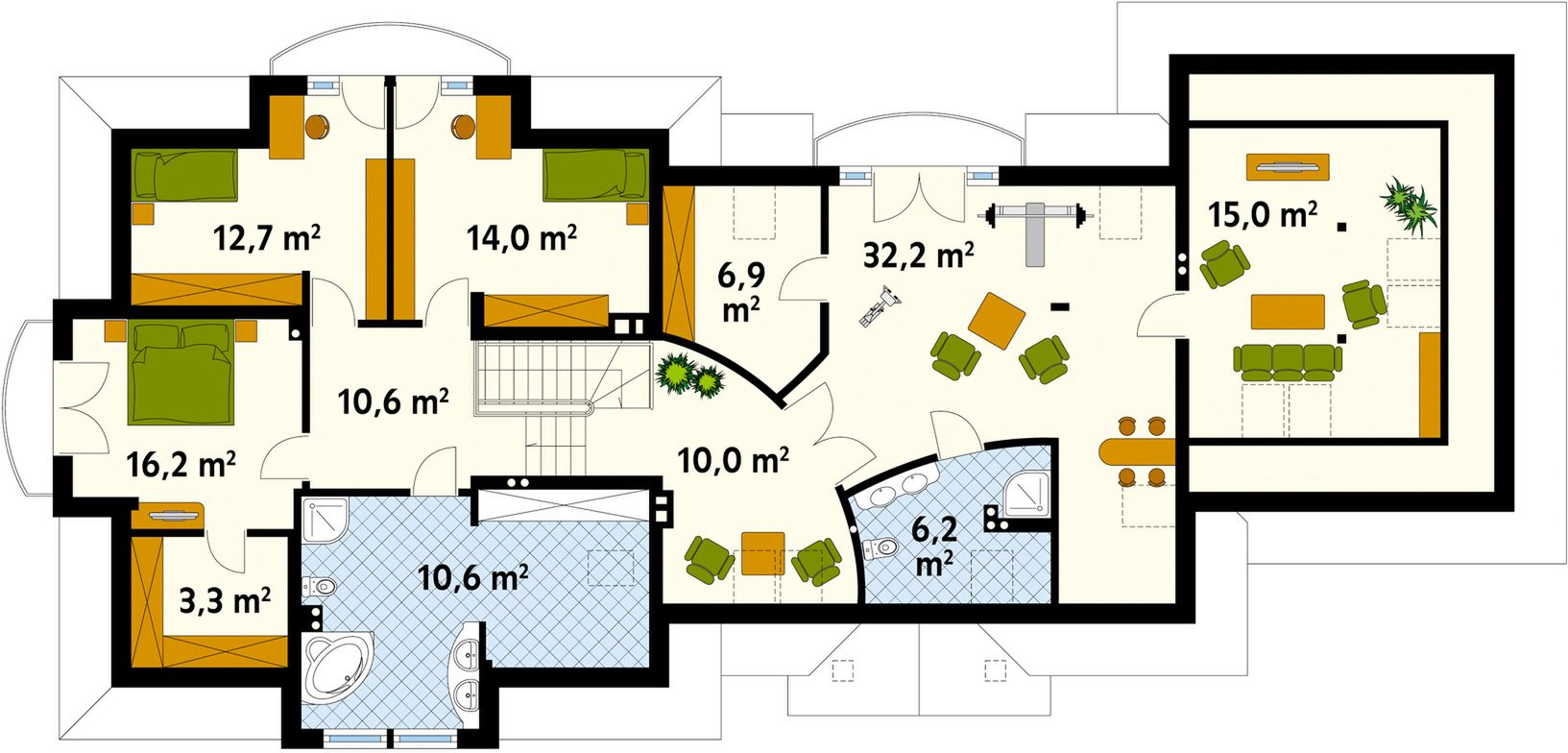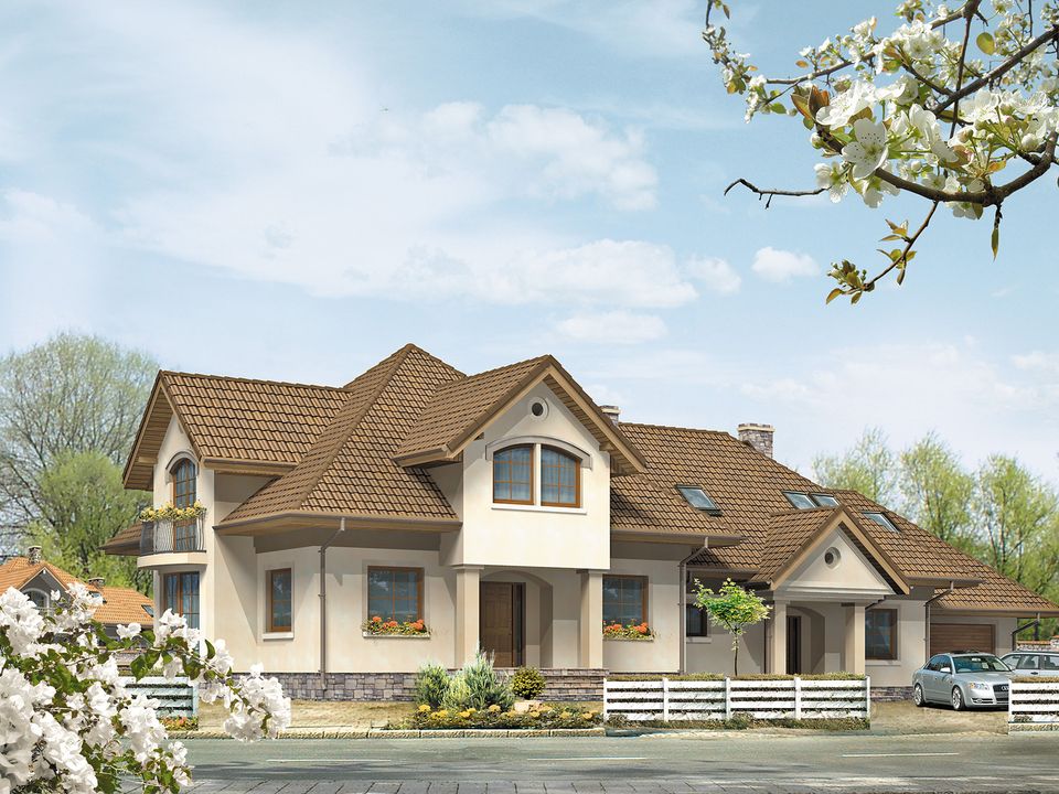 Graficzne opracowanie rzutów poglądowych widocznych na karcie projektu zostało wykonane przez Extradom.pl. Prezentowane przez Extradom.pl wizualizacje wykonane zostały przez autora projektu i należy poczytywać je jedynie za przykład i propozycję wykończenia, wizję architektoniczną autora projektu. Ostateczne wykończenie budynku może nastąpić na wiele sposobów. Szczegółowe rozwiązania zastosowane w oferowanej dokumentacji - w tym również ilość, lokalizacje i wygląd okien, drzwi, kominów - mogą w niewielkim stopniu różnić się od prezentowanej wizualizacji budynku.