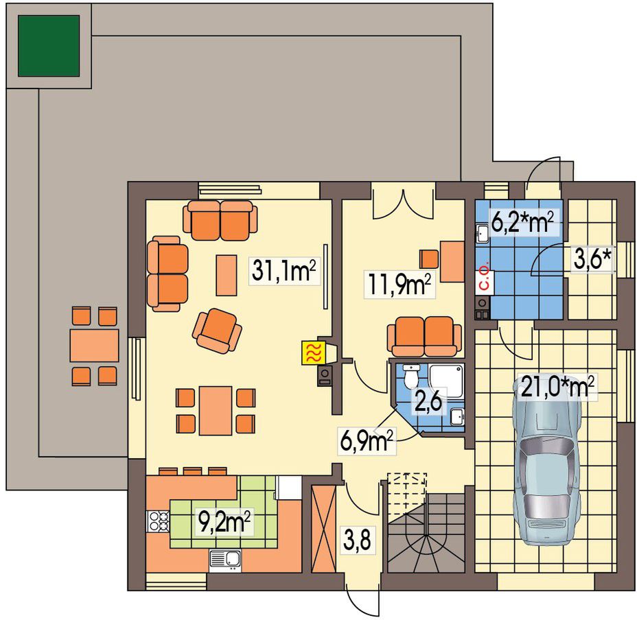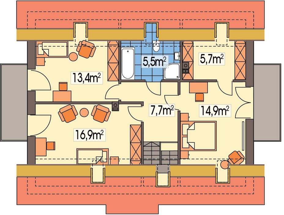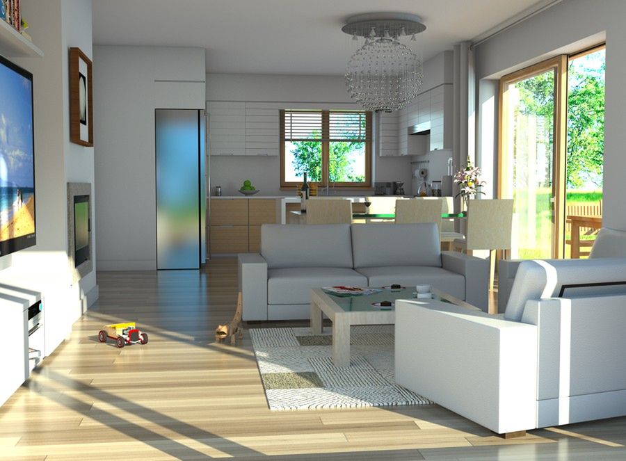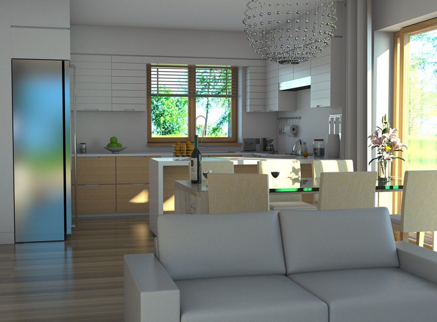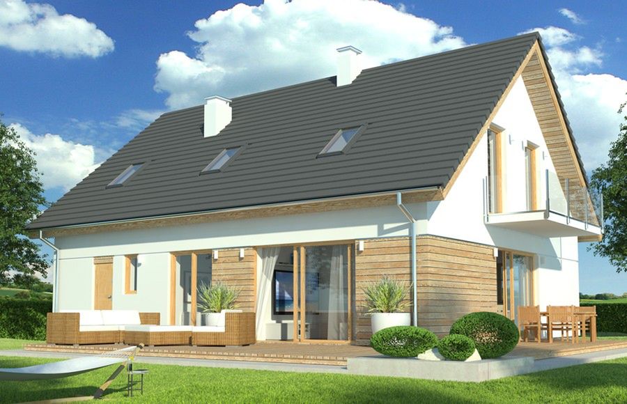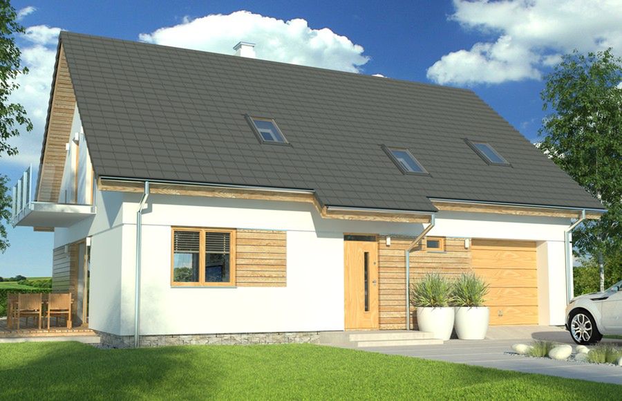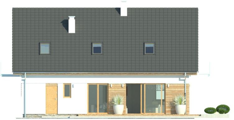 Graficzne opracowanie rzutów poglądowych widocznych na karcie projektu zostało wykonane przez Extradom.pl. Prezentowane przez Extradom.pl wizualizacje wykonane zostały przez autora projektu i należy poczytywać je jedynie za przykład i propozycję wykończenia, wizję architektoniczną autora projektu. Ostateczne wykończenie budynku może nastąpić na wiele sposobów. Szczegółowe rozwiązania zastosowane w oferowanej dokumentacji - w tym również ilość, lokalizacje i wygląd okien, drzwi, kominów - mogą w niewielkim stopniu różnić się od prezentowanej wizualizacji budynku.