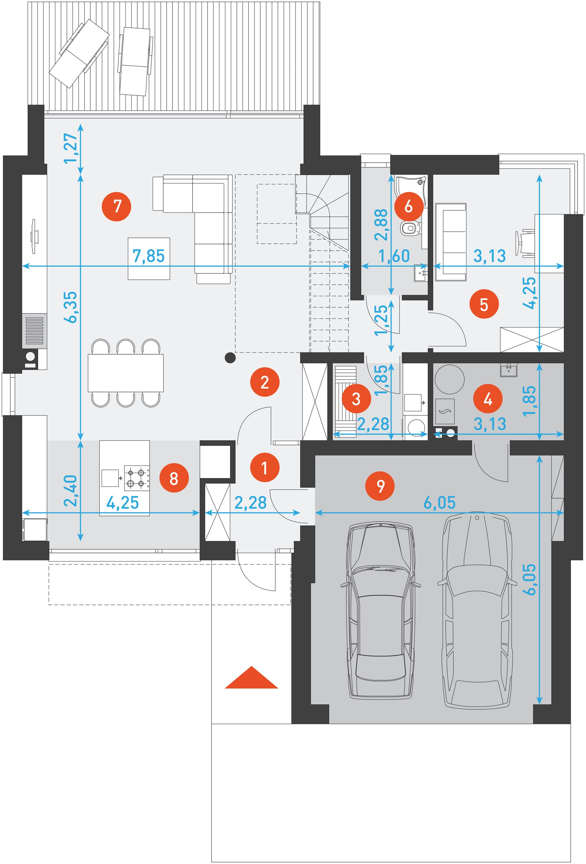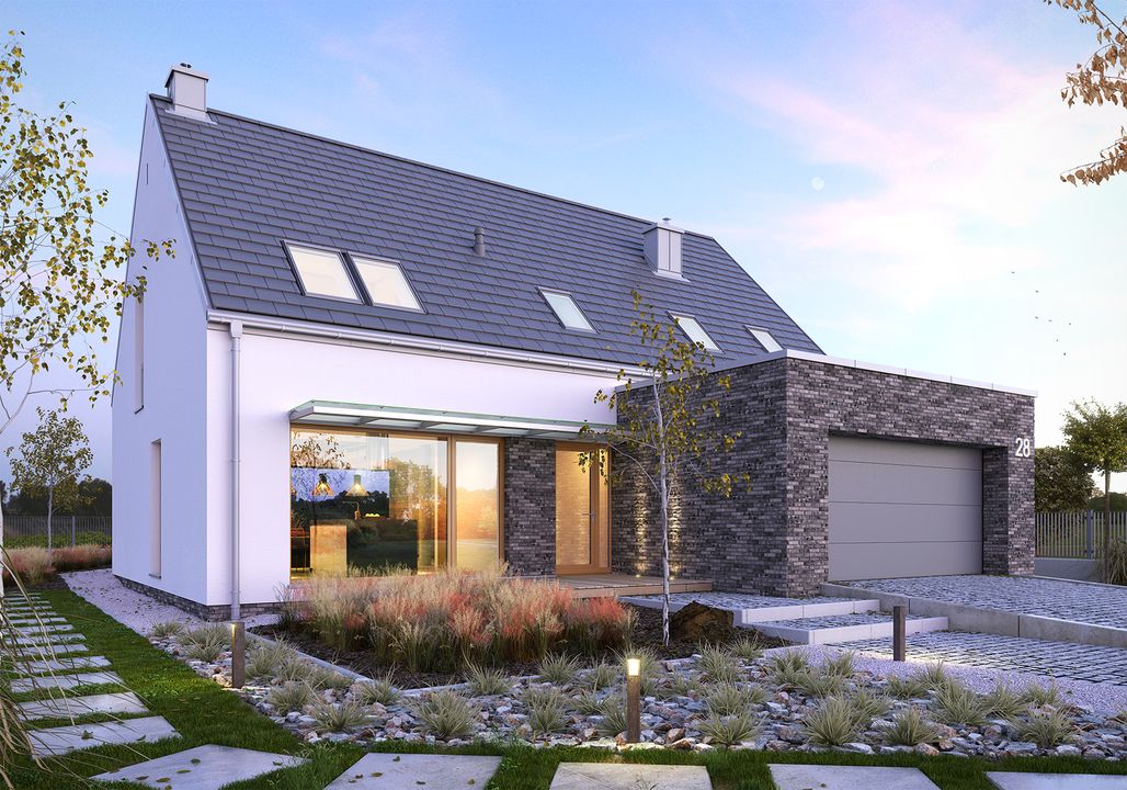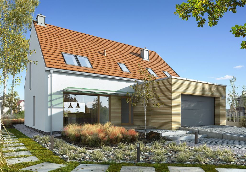 Konstrukcja: zgodna z normami EUROKOD. Fundamenty: tradycyjne ławy i stopy żelbetowe. Ściany: bloczek silikatowy + wełna mineralna na etapie adaptacji projektu istnieje możliwość zamiany bloczka silikatowego na inny materiał o podobnych parametrach wytrzymałosciowych, np. na pustak ceramiczny. Elewacja: tynk, deska elewacyjna deskę elewacyjną wykorzystaną jako materiał dekoracyjny można zamienić na etapie adaptacji projektu na inny, np. na płytkę klinkierową. Stropy: żelbetowe wylewane na etapie adaptacji projektu istnieje możliwość zmiany technologii stropu na gęstożebrowy lub prefabrykowany. Schody: konstrukcji lekkiej konstrukcja oraz materiały wykończeniowe schodów przewidziane do indywidualnej aranżacji. Możesz skorzystać z usług naszego Partnera. Formularz ofertowy dostępny w zakładce „kosztorys”. Dach: dachówka ceramiczna lub cementowa konstrukcja więźby przewidziana pod pokrycie ciężkie dla I strefy wiatrowej i II strefy śniegowej.