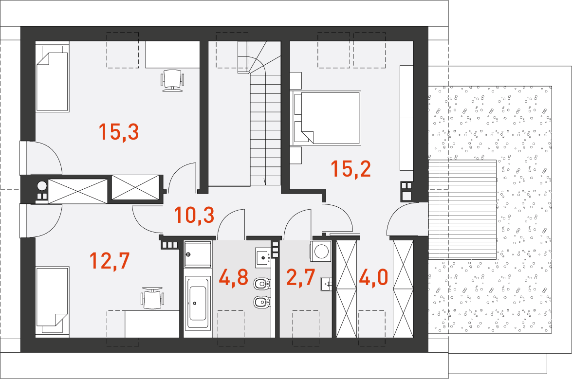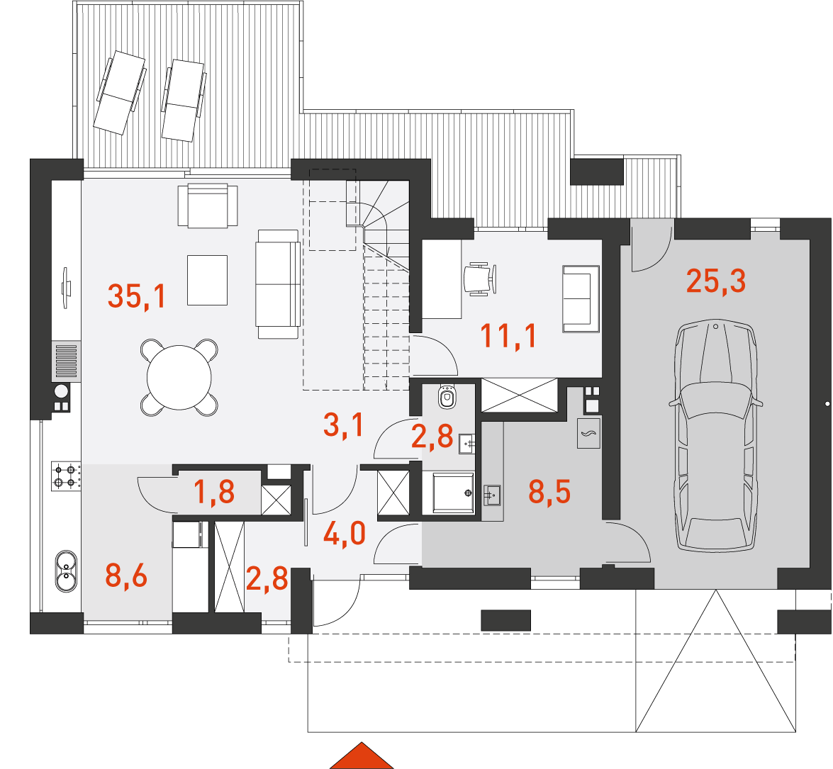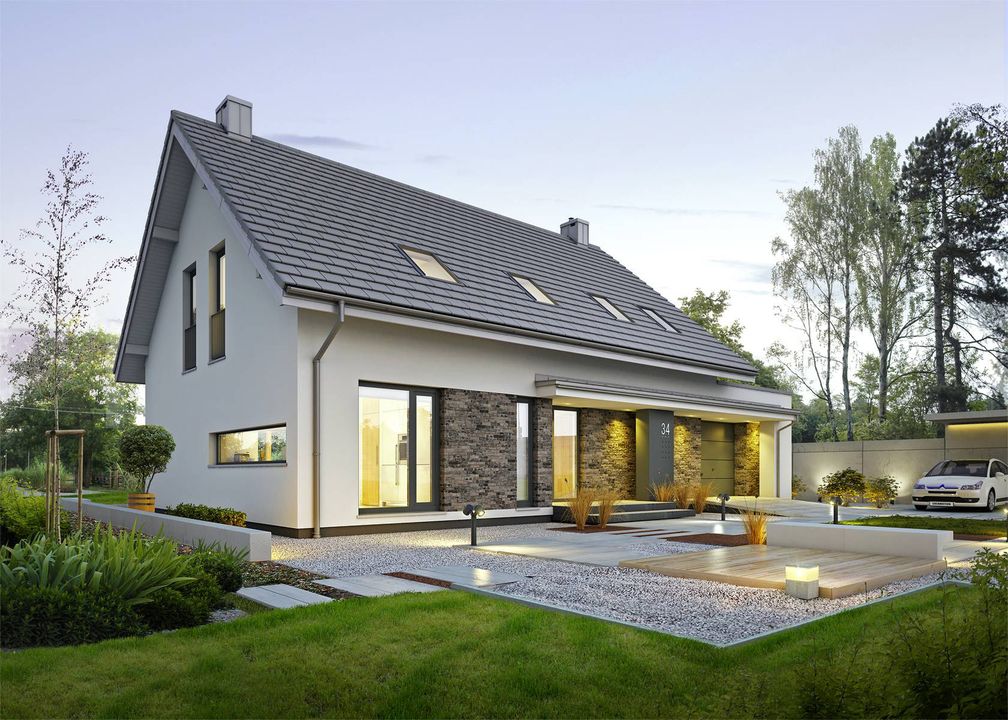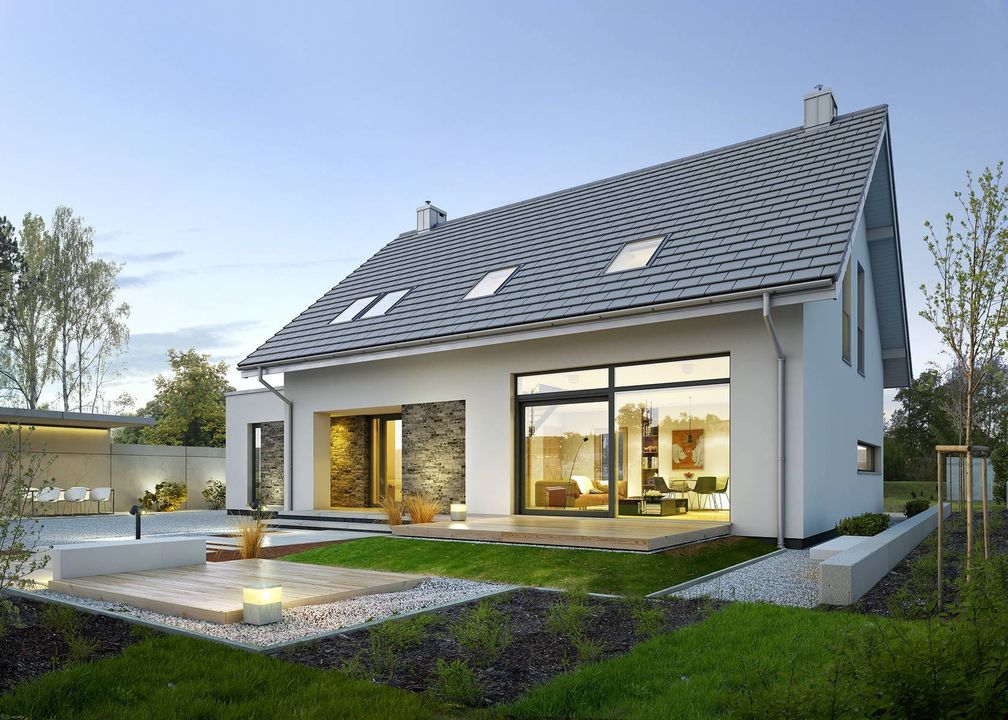 Konstrukcja: zgodna z normami EUROKOD. Fundamenty: tradycyjne ławy i stopy żelbetowe. Ściany: bloczek silikatowy + styropian na etapie adaptacji projektu istnieje możliwość zamiany bloczka silikatowego na inny materiał o podobnych parametrach wytrzymałosciowych, np. na pustak ceramiczny. Elewacja: tynk, płytka klinkierowa ręcznie formowana płytkę klinkierową wykorzystaną jako materiał dekoracyjny można zamienić na etapie adaptacji projektu na inny, np. na deskę elewacyjną. Stropy: żelbetowe wylewane na etapie adaptacji projektu istnieje możliwość zmiany technologii stropu na gęstożebrowy lub prefabrykowany. Schody: konstrukcji lekkiej konstrukcja oraz materiały wykończeniowe schodów przewidziane do indywidualnej aranżacji. Możesz skorzystać z usług naszego Partnera. Formularz ofertowy dostępny w zakładce „kosztorys”. Dach: dachówka ceramiczna lub cementowa konstrukcja więźby przewidziana pod pokrycie ciężkie dla I strefy wiatrowej i II strefy śniegowej.