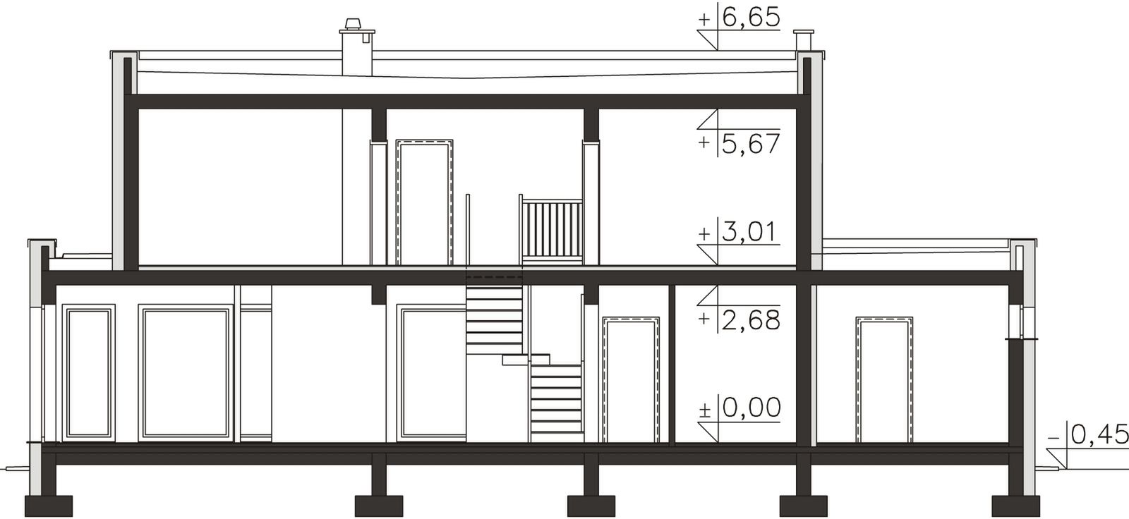 Fundamenty - rozwiązanie o podwyższonej izolacji termicznej. Ściany zewnętrzne - Bloczek silikatowy 24 cm + styropian 20 cm. Strop - żelbetowy. Dach - stropodach żelbetowy. Ogrzewanie - c.o. grzejnikowe + c.w.u. - kocioł gazowy. Wentylacja - rekuperacja.