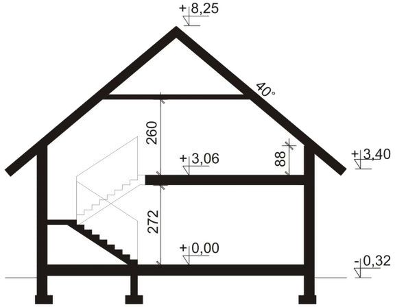 Fundamenty: bezpośrednie, na ławach i stopach fundamentowych. Ściany zewnętrzne: bloczki z bet. komórkowego - 24 cm + styropian TERMO ORGANIKA typ Fasada 16 cm. Ściany wewnętrzne: bloczki z bet. komórkowego - 24 cm (działowe - 12 cm) + działowe z płyty G-K na ruszcie (poddasze). Strop: gęstożebrowy Teriva I oraz żelbetowy monolityczny grubości 24 i 14 cm. Elewacje: tynk - System Platinum firmy TERMO ORGANIKA, płytki klinkierowe, deska elewacyjna. Pokrycie dachu: dachówka ceramiczna. Konstrukcja dachu: drewniana o układzie konstrukcyjnym krokwiowo-płatwiowym i krokwiowo-jętkowym. Schody wewnętrzne: żelbetowe monolityczne płytowe, zabiegowe. Ogrzewanie: kocioł gazowy kondensacyjny lub kocioł na paliwo stałe, dodatkowe źródło ciepła - kominek z płaszczem wodnym. Projekt jest zgodny z wymaganiami WT2024, a konstrukcja była obliczana zgodnie z eurokodami.