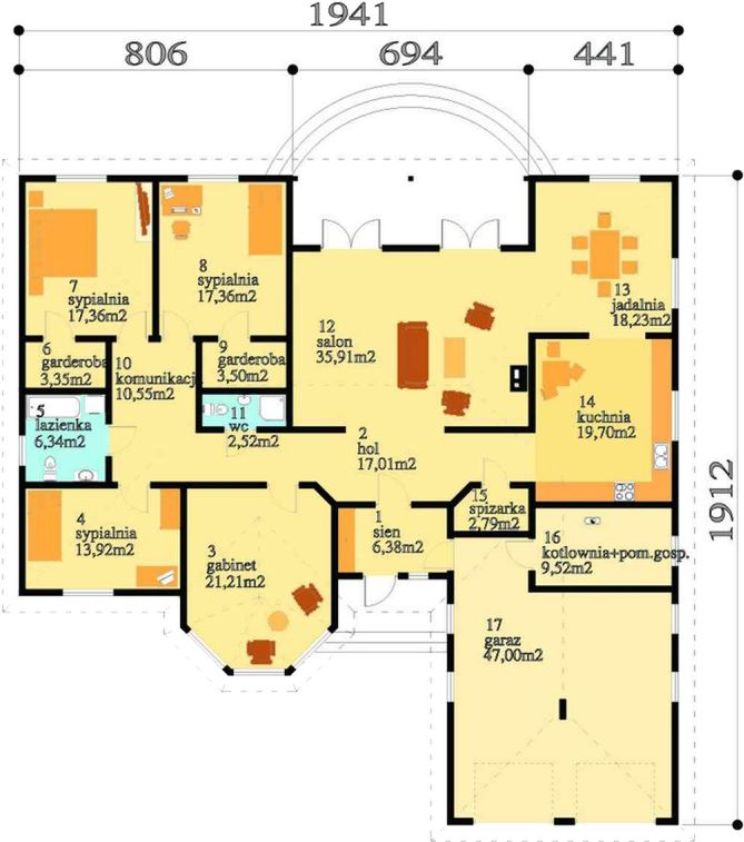 Graficzne opracowanie rzutów poglądowych widocznych na karcie projektu zostało wykonane przez Extradom.pl. Prezentowane przez Extradom.pl wizualizacje wykonane zostały przez autora projektu i należy poczytywać je jedynie za przykład i propozycję wykończenia, wizję architektoniczną autora projektu. Ostateczne wykończenie budynku może nastąpić na wiele sposobów. Szczegółowe rozwiązania zastosowane w oferowanej dokumentacji - w tym również ilość, lokalizacje i wygląd okien, drzwi, kominów - mogą w niewielkim stopniu różnić się od prezentowanej wizualizacji budynku.