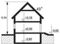 Ściany: 2-warstwowe - pustak ceramiczny + styropian. Stropy: żelbetowe, wylewane. Dach: dachówka ceramiczna CREATON, kąt nachylenia 43°. Ogrzewanie: gazowe, olejowe.
