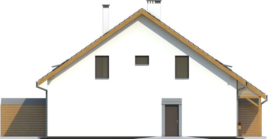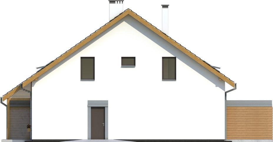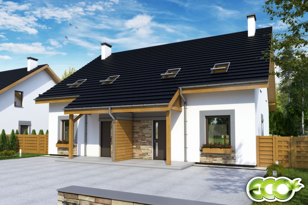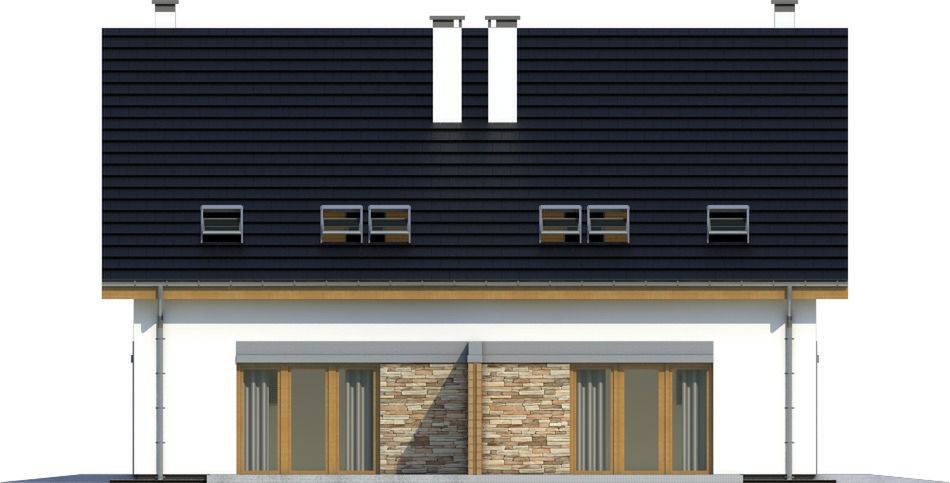 Graficzne opracowanie rzutów poglądowych widocznych na karcie projektu zostało wykonane przez Extradom.pl. Prezentowane przez Extradom.pl wizualizacje wykonane zostały przez autora projektu i należy poczytywać je jedynie za przykład i propozycję wykończenia, wizję architektoniczną autora projektu. Ostateczne wykończenie budynku może nastąpić na wiele sposobów. Szczegółowe rozwiązania zastosowane w oferowanej dokumentacji - w tym również ilość, lokalizacje i wygląd okien, drzwi, kominów - mogą w niewielkim stopniu różnić się od prezentowanej wizualizacji budynku.