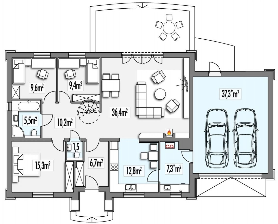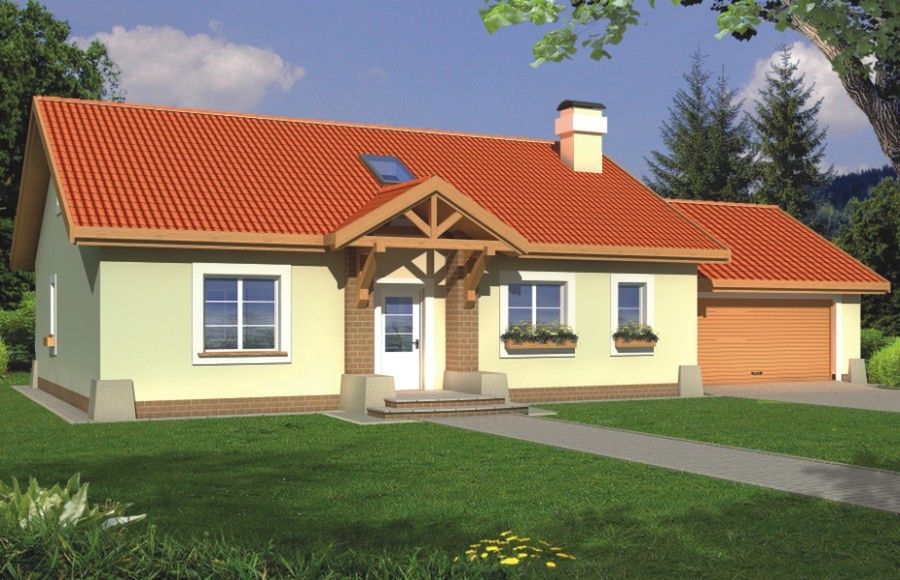 Graficzne opracowanie rzutów poglądowych widocznych na karcie projektu zostało wykonane przez Extradom.pl. Prezentowane przez Extradom.pl wizualizacje wykonane zostały przez autora projektu i należy poczytywać je jedynie za przykład i propozycję wykończenia, wizję architektoniczną autora projektu. Ostateczne wykończenie budynku może nastąpić na wiele sposobów. Szczegółowe rozwiązania zastosowane w oferowanej dokumentacji - w tym również ilość, lokalizacje i wygląd okien, drzwi, kominów - mogą w niewielkim stopniu różnić się od prezentowanej wizualizacji budynku.