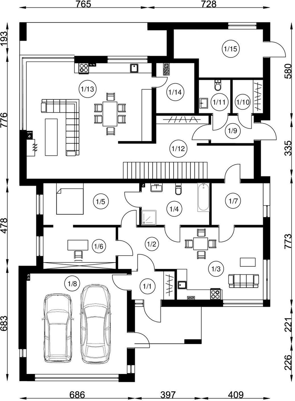 Graficzne opracowanie rzutów poglądowych widocznych na karcie projektu zostało wykonane przez Extradom.pl. Prezentowane przez Extradom.pl wizualizacje wykonane zostały przez autora projektu i należy poczytywać je jedynie za przykład i propozycję wykończenia, wizję architektoniczną autora projektu. Ostateczne wykończenie budynku może nastąpić na wiele sposobów. Szczegółowe rozwiązania zastosowane w oferowanej dokumentacji - w tym również ilość, lokalizacje i wygląd okien, drzwi, kominów - mogą w niewielkim stopniu różnić się od prezentowanej wizualizacji budynku.