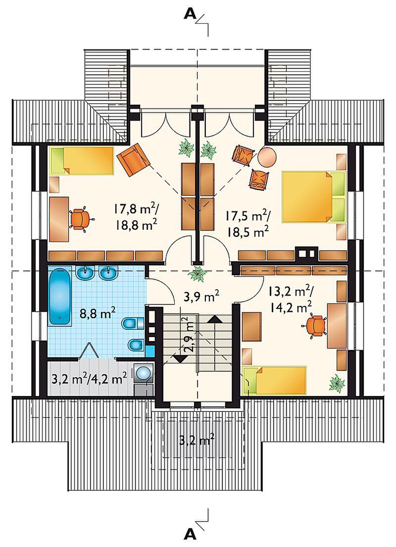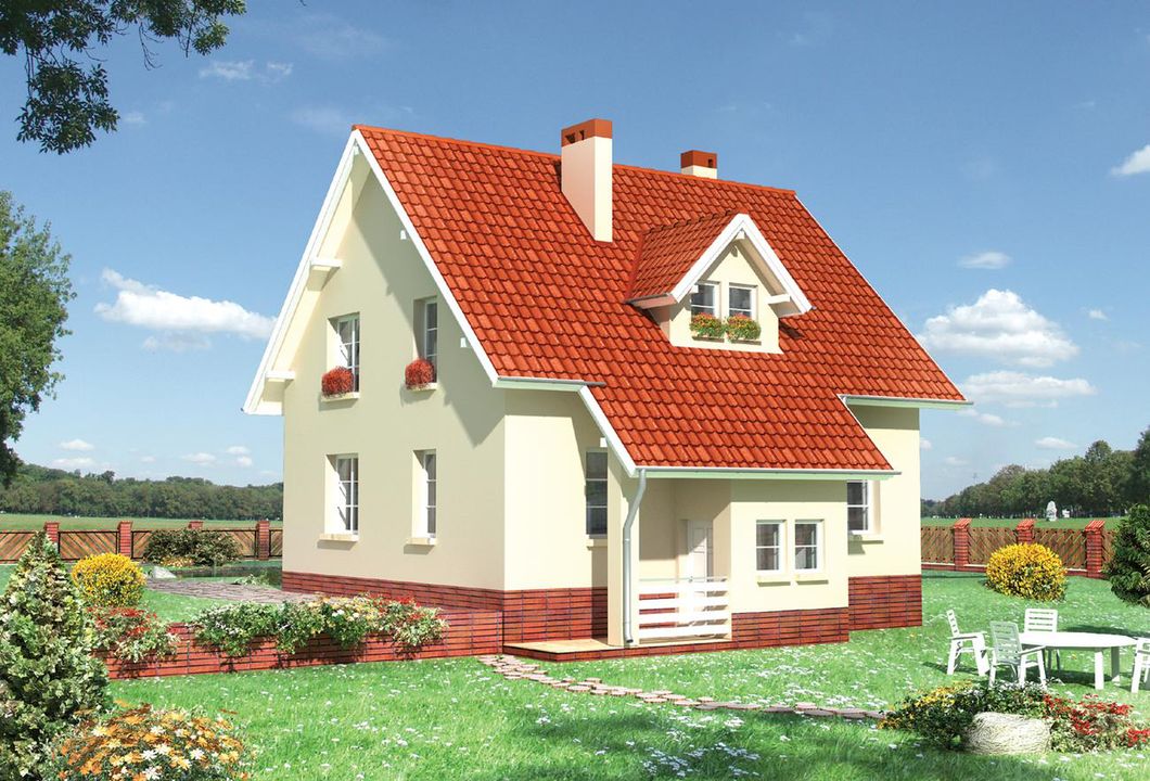 Graficzne opracowanie rzutów poglądowych widocznych na karcie projektu zostało wykonane przez Extradom.pl. Prezentowane przez Extradom.pl wizualizacje wykonane zostały przez autora projektu i należy poczytywać je jedynie za przykład i propozycję wykończenia, wizję architektoniczną autora projektu. Ostateczne wykończenie budynku może nastąpić na wiele sposobów. Szczegółowe rozwiązania zastosowane w oferowanej dokumentacji - w tym również ilość, lokalizacje i wygląd okien, drzwi, kominów - mogą w niewielkim stopniu różnić się od prezentowanej wizualizacji budynku.