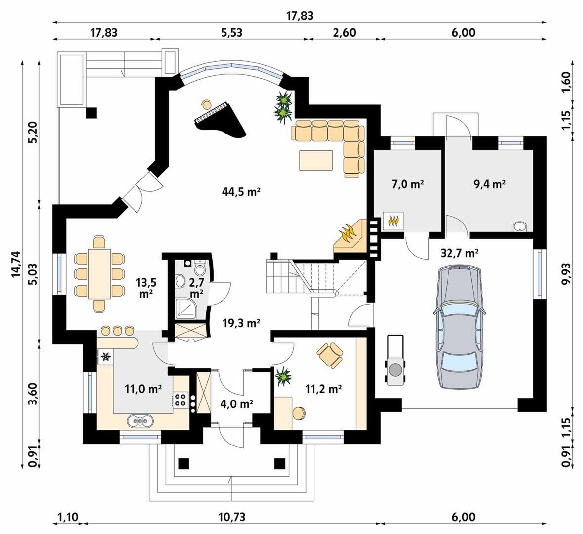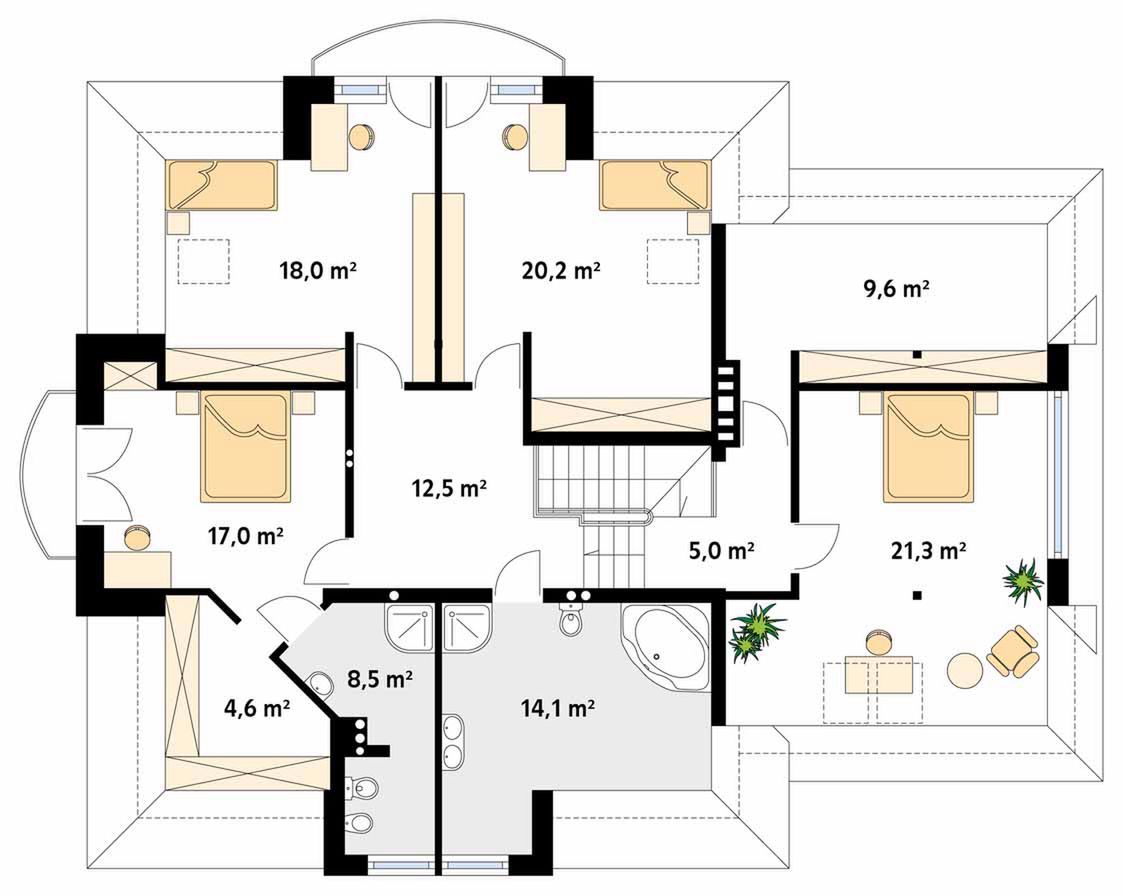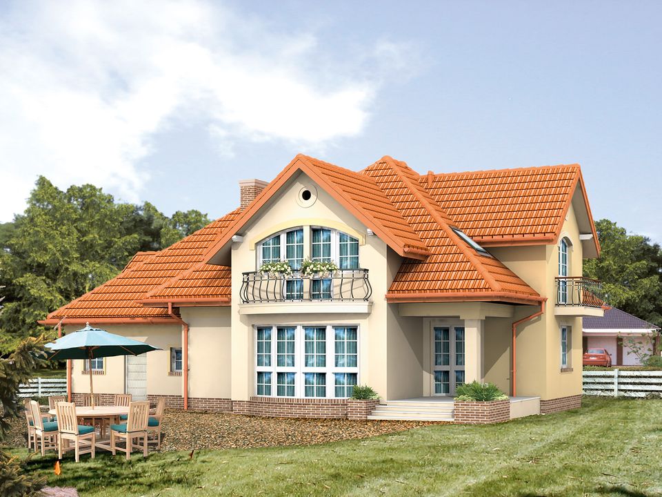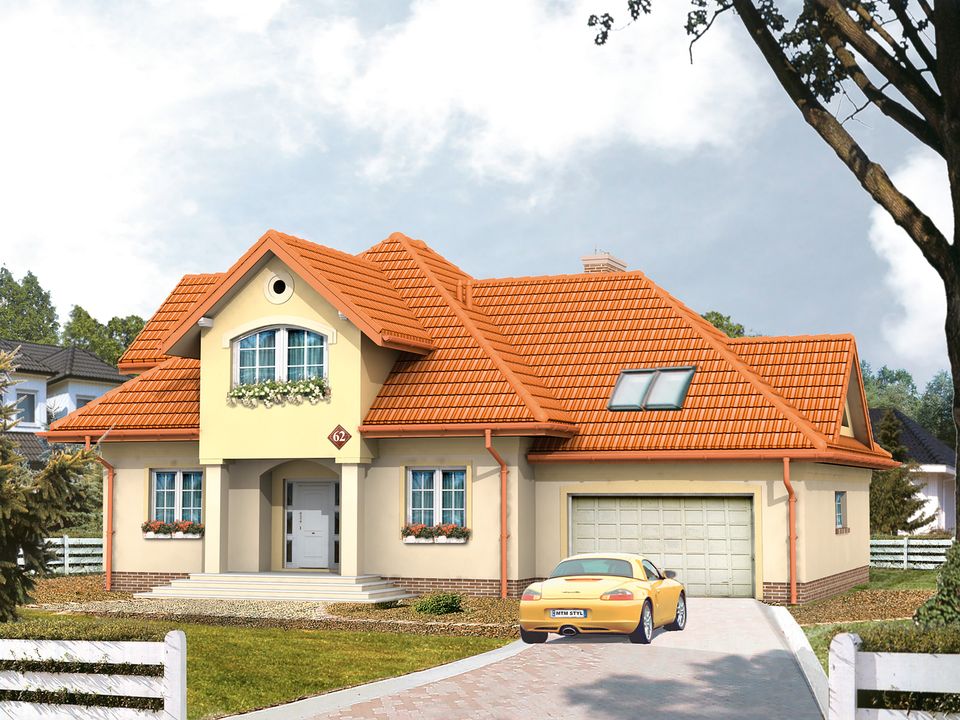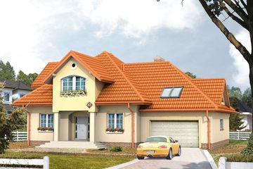 Graficzne opracowanie rzutów poglądowych widocznych na karcie projektu zostało wykonane przez Extradom.pl. Prezentowane przez Extradom.pl wizualizacje wykonane zostały przez autora projektu i należy poczytywać je jedynie za przykład i propozycję wykończenia, wizję architektoniczną autora projektu. Ostateczne wykończenie budynku może nastąpić na wiele sposobów. Szczegółowe rozwiązania zastosowane w oferowanej dokumentacji - w tym również ilość, lokalizacje i wygląd okien, drzwi, kominów - mogą w niewielkim stopniu różnić się od prezentowanej wizualizacji budynku.