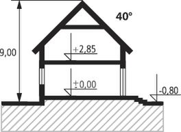 Ściany: 2-warstwowe - pustak ceramiczny + styropian. Stropy: żelbetowe, wylewane. Dach: dachówka ceramiczna CREATON, kąt nachylenia 40°. Ogrzewanie: gazowe.