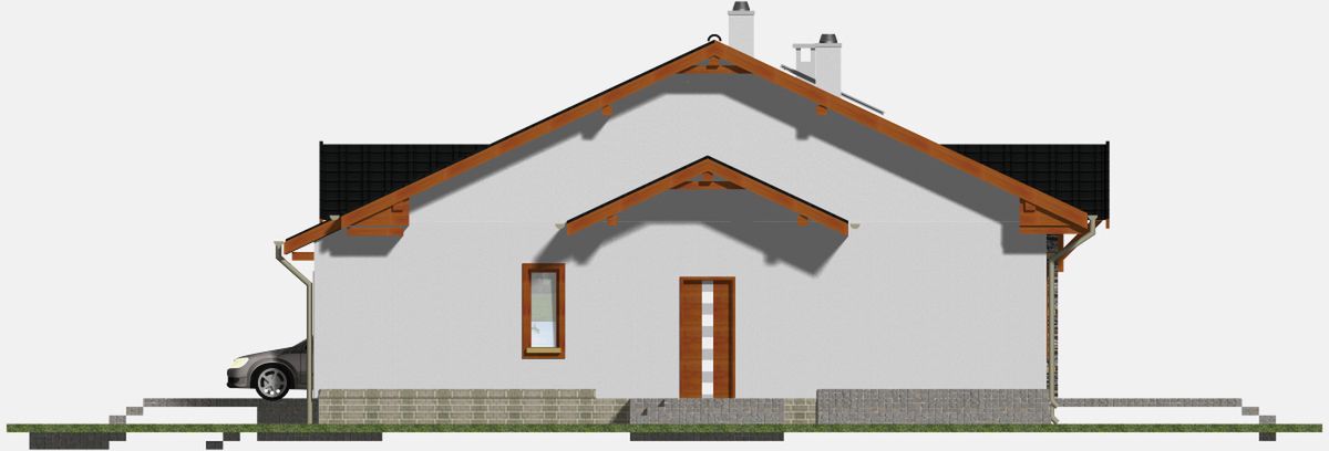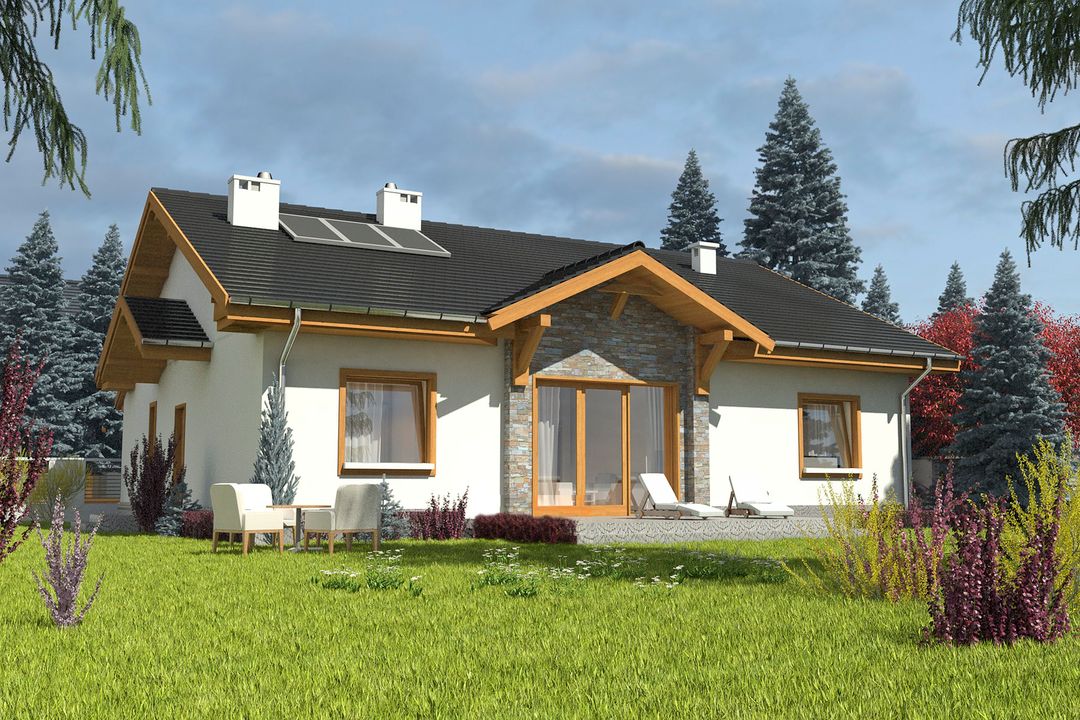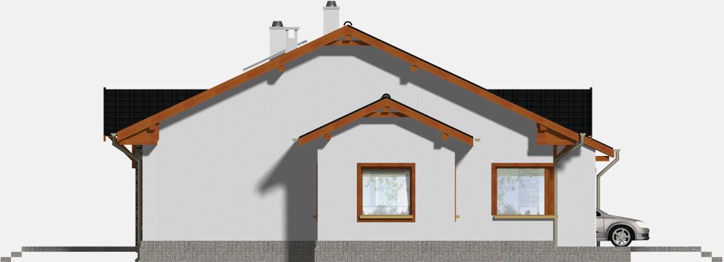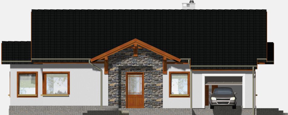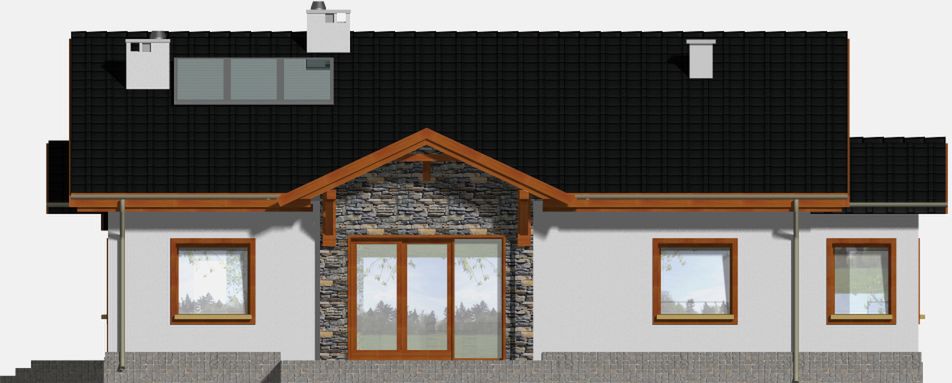 Graficzne opracowanie rzutów poglądowych widocznych na karcie projektu zostało wykonane przez Extradom.pl. Prezentowane przez Extradom.pl wizualizacje wykonane zostały przez autora projektu i należy poczytywać je jedynie za przykład i propozycję wykończenia, wizję architektoniczną autora projektu. Ostateczne wykończenie budynku może nastąpić na wiele sposobów. Szczegółowe rozwiązania zastosowane w oferowanej dokumentacji - w tym również ilość, lokalizacje i wygląd okien, drzwi, kominów - mogą w niewielkim stopniu różnić się od prezentowanej wizualizacji budynku.