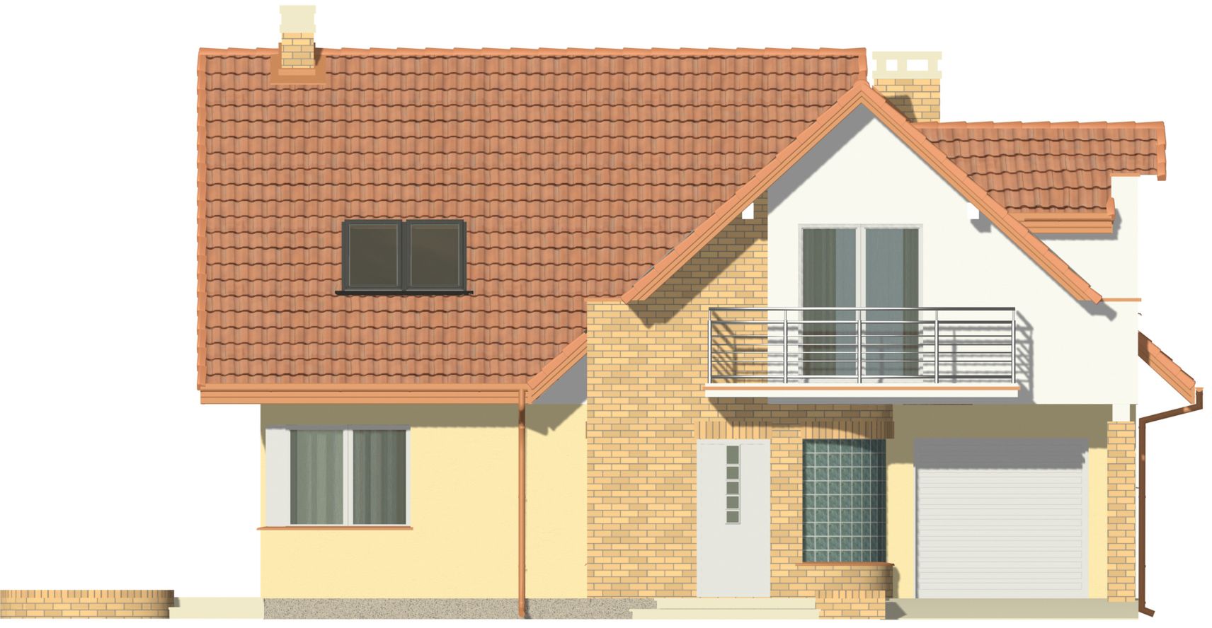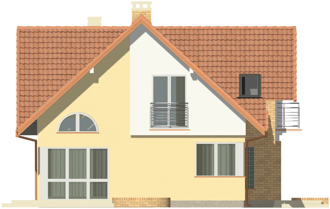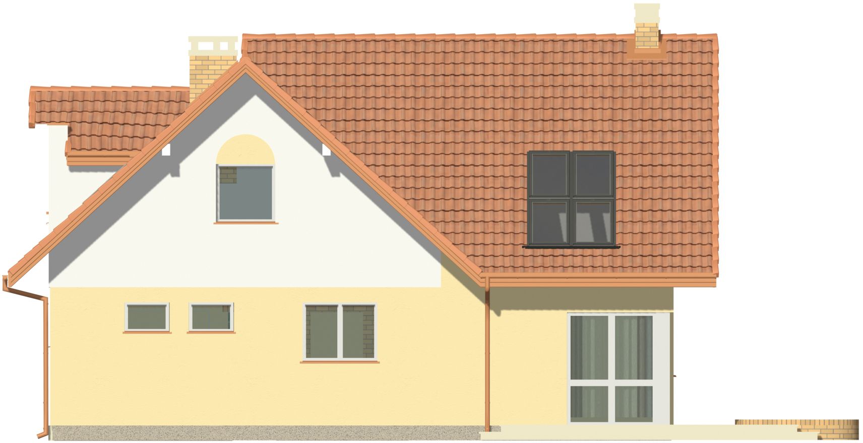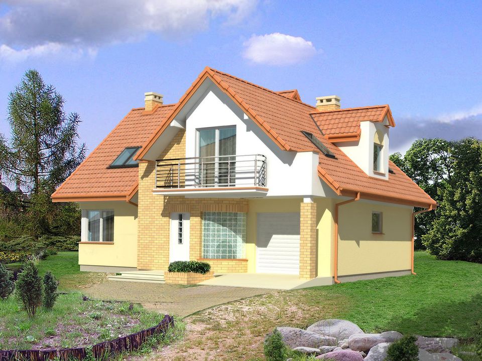 Graficzne opracowanie rzutów poglądowych widocznych na karcie projektu zostało wykonane przez Extradom.pl. Prezentowane przez Extradom.pl wizualizacje wykonane zostały przez autora projektu i należy poczytywać je jedynie za przykład i propozycję wykończenia, wizję architektoniczną autora projektu. Ostateczne wykończenie budynku może nastąpić na wiele sposobów. Szczegółowe rozwiązania zastosowane w oferowanej dokumentacji - w tym również ilość, lokalizacje i wygląd okien, drzwi, kominów - mogą w niewielkim stopniu różnić się od prezentowanej wizualizacji budynku.