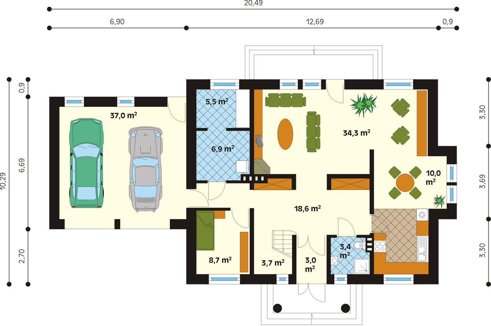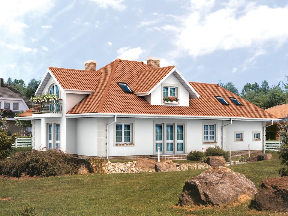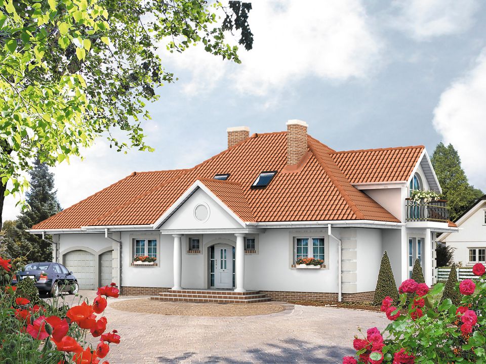 Dach: dachówka, kąt nachylenia 38°. Stropy: żelbetowe, wylewane. Ściany: 3-warstwowe - pustak ceramiczny lub bloczek silikatowy. Ogrzewanie: gazowe, olejowe.