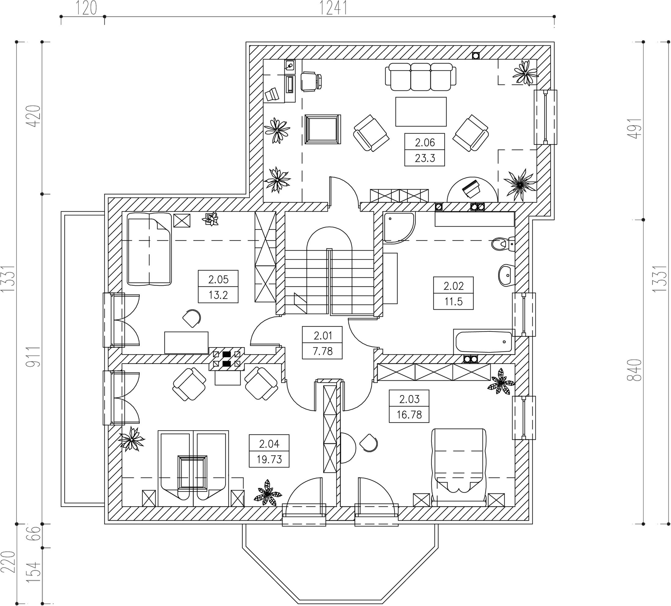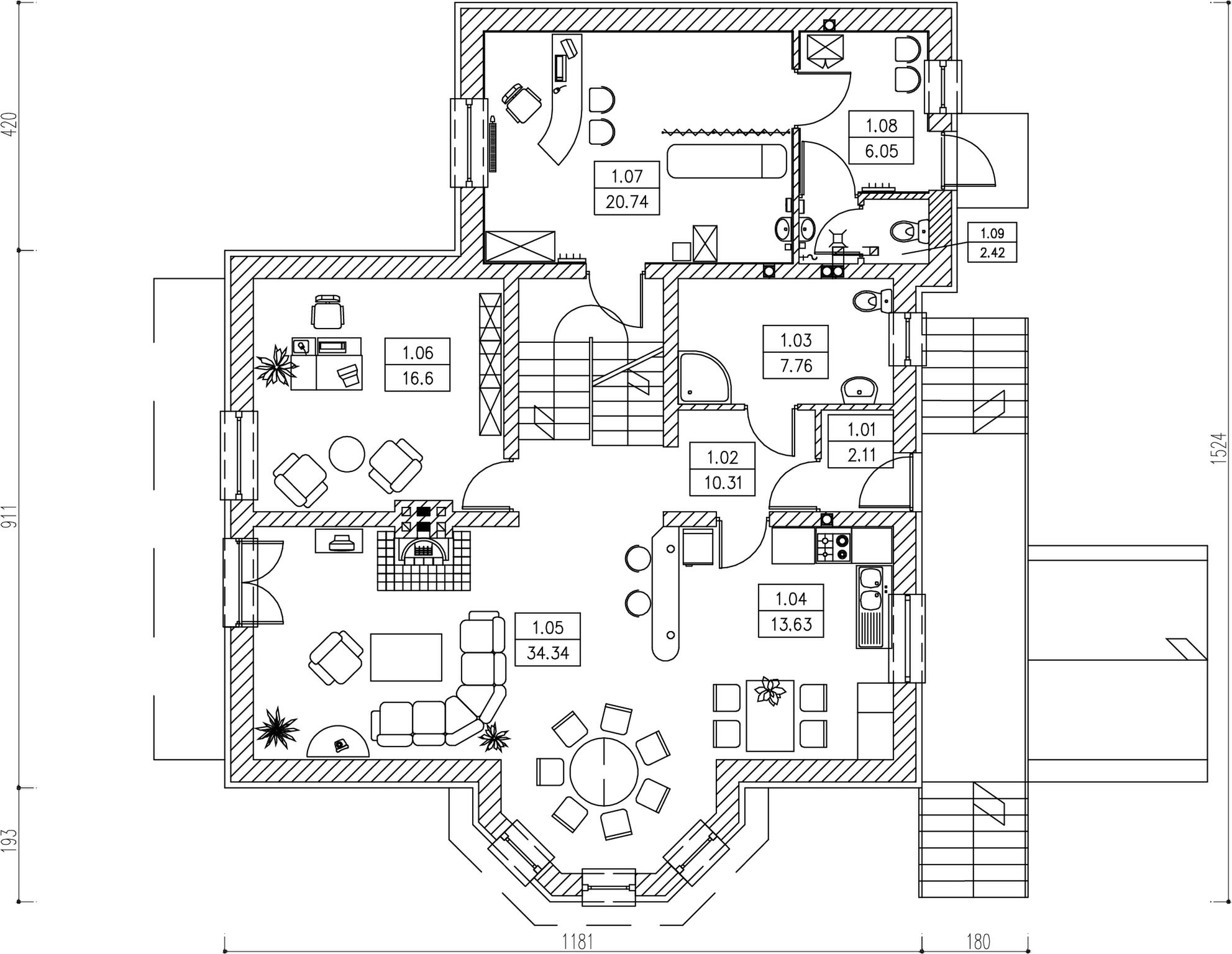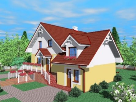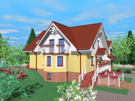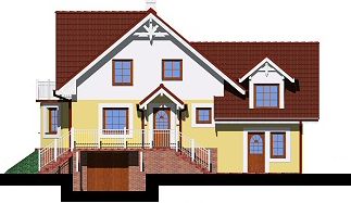 Graficzne opracowanie rzutów poglądowych widocznych na karcie projektu zostało wykonane przez Extradom.pl. Prezentowane przez Extradom.pl wizualizacje wykonane zostały przez autora projektu i należy poczytywać je jedynie za przykład i propozycję wykończenia, wizję architektoniczną autora projektu. Ostateczne wykończenie budynku może nastąpić na wiele sposobów. Szczegółowe rozwiązania zastosowane w oferowanej dokumentacji - w tym również ilość, lokalizacje i wygląd okien, drzwi, kominów - mogą w niewielkim stopniu różnić się od prezentowanej wizualizacji budynku.