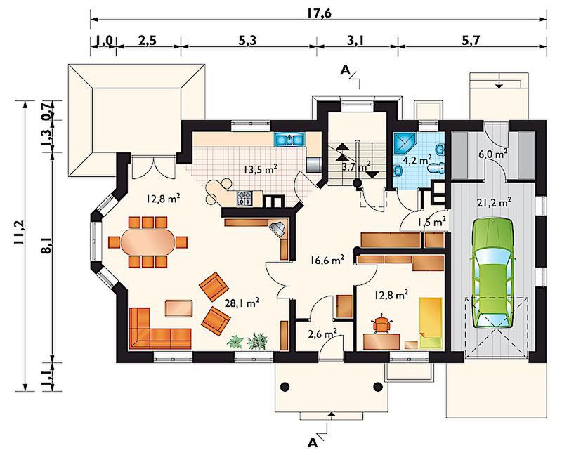 Graficzne opracowanie rzutów poglądowych widocznych na karcie projektu zostało wykonane przez Extradom.pl. Prezentowane przez Extradom.pl wizualizacje wykonane zostały przez autora projektu i należy poczytywać je jedynie za przykład i propozycję wykończenia, wizję architektoniczną autora projektu. Ostateczne wykończenie budynku może nastąpić na wiele sposobów. Szczegółowe rozwiązania zastosowane w oferowanej dokumentacji - w tym również ilość, lokalizacje i wygląd okien, drzwi, kominów - mogą w niewielkim stopniu różnić się od prezentowanej wizualizacji budynku.