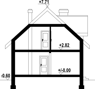 Wysokość ścianki kolankowej: 0.97 m. Strop: płyta żelbetowa. Pokrycie dachu: dachówka ceramiczna. Ściany zewnętrzne: pustaki ceramiczne + styropian. Ściany wewnętrzne: pustaki ceramiczne. Typ ogrzewania: kocioł gazowy.