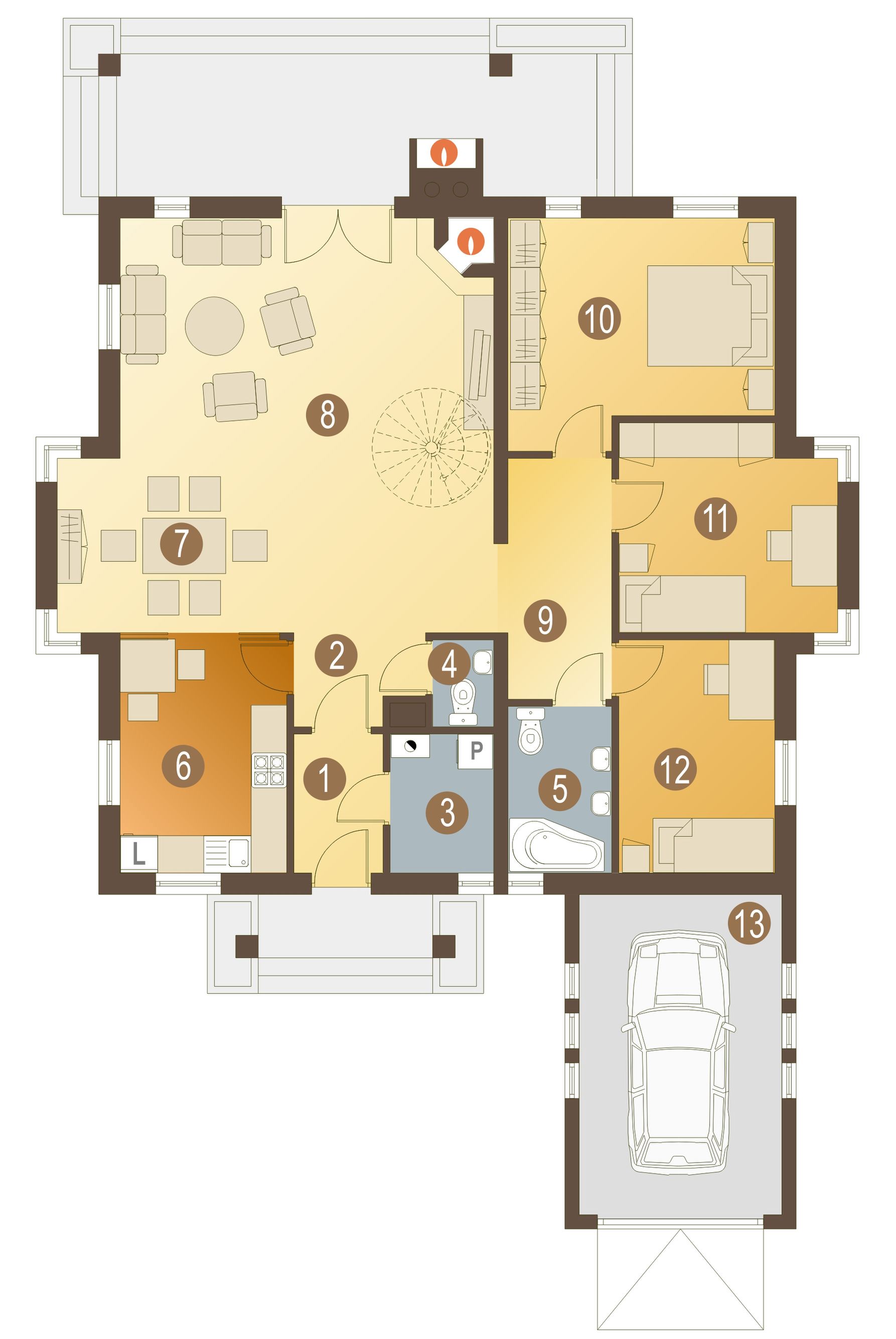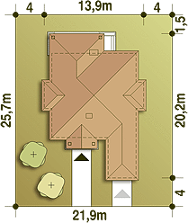 Graficzne opracowanie rzutów poglądowych widocznych na karcie projektu zostało wykonane przez Extradom.pl. Prezentowane przez Extradom.pl wizualizacje wykonane zostały przez autora projektu i należy poczytywać je jedynie za przykład i propozycję wykończenia, wizję architektoniczną autora projektu. Ostateczne wykończenie budynku może nastąpić na wiele sposobów. Szczegółowe rozwiązania zastosowane w oferowanej dokumentacji - w tym również ilość, lokalizacje i wygląd okien, drzwi, kominów - mogą w niewielkim stopniu różnić się od prezentowanej wizualizacji budynku.