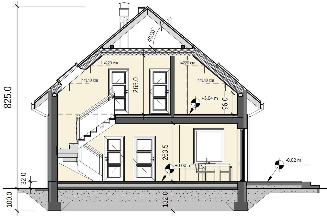 Posadowienie bezpośrednie na zbrojonych ławach i stopach fundamentowych wykonanych z betonu B 20. Ściany fundamentowe: murowane z bloczków betonowych M6. Ściany zewnętrzne: bloczki gazobetonowe gr. 25cm na zaprawie systemowej, ciepłochronnej, ocieplony styropianem fasadowym gr. 15cm. Do ocieplenia budynku zaprojektowano użycie styropianu grafitowego gr. 15 cm, o współczynniku „lambda” nie przekraczającym 0,035 W(mK) i „oporze cieplnym” nie mniejszym niż Rd – 4,0 m2k/W. Zastosowanie materiałów budowlanych (ocieplenie ścian, dachu, podłogi na gruncie, okien i drzwi zewnętrznych) użytych w projekcie odpowiada nowym wymaganiom obowiązującym od stycznia 2021 roku (WT2021). Ściany nośne wewnętrzne: bloczki gazobetonowe gr. 25cm na zaprawie cementowo-wapiennej lub systemowej. Ściany wewnętrzne działowe: bloczki gazobetonowe gr. 12cm. Strop gęstożebrowy z wypełnieniem pustakami betonowymi, zalewany wraz z wieńcami betonem B 20. Konstrukcja dachu: drewniana, drewno klasy C24, więźba dachowa krokwiowo-jętkowa. Budynek, w wersji podstawowej, jest zaprojektowany z pomieszczeniem kotłowni wyposażonej w kocioł ekologiczny na paliwo stałe, biomasę (granulat drzewny – pellet) i spełnia wszystkie wymagania dotyczące WT2021. Istnieje możliwość zamówienia dokumentacji projektowej w wersji ogrzewania gazowego ze wspomaganiem instalacją solarną lub ogrzewania nowoczesną pompa ciepła typu powietrze – woda i ogrzewaniem podłogowym (zapytaj o cenę). Standard energetyczny budynku, w każdej wersji ogrzewania jest w pełni spełniający wymagania WT2021. Projekt pod względem konstrukcyjnym spełnia normy zgodne z Eurokodami.