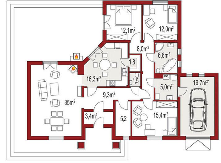 Graficzne opracowanie rzutów poglądowych widocznych na karcie projektu zostało wykonane przez Extradom.pl. Prezentowane przez Extradom.pl wizualizacje wykonane zostały przez autora projektu i należy poczytywać je jedynie za przykład i propozycję wykończenia, wizję architektoniczną autora projektu. Ostateczne wykończenie budynku może nastąpić na wiele sposobów. Szczegółowe rozwiązania zastosowane w oferowanej dokumentacji - w tym również ilość, lokalizacje i wygląd okien, drzwi, kominów - mogą w niewielkim stopniu różnić się od prezentowanej wizualizacji budynku.