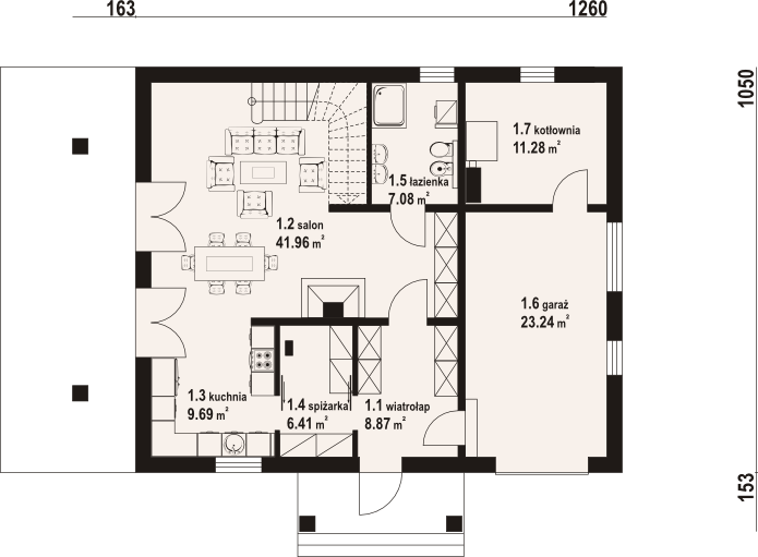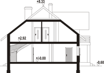 Wysokość ścianki kolankowej: 1 m. Strop: płyta żelbetowa. Pokrycie dachu: dachówka ceramiczna. Ściany zewnętrzne: pustaki ceramiczne + styropian. Ściany wewnętrzne: pustaki ceramiczne. Typ ogrzewania: kocioł gazowy lub kocioł na paliwo stałe.