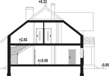 Wysokość ścianki kolankowej: 1 m. Strop: płyta żelbetowa. Pokrycie dachu: dachówka ceramiczna. Ściany zewnętrzne: pustaki ceramiczne + styropian. Ściany wewnętrzne: pustaki ceramiczne. Typ ogrzewania: kocioł gazowy.