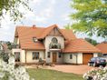 Graficzne opracowanie rzutów poglądowych widocznych na karcie projektu zostało wykonane przez Extradom.pl. Prezentowane przez Extradom.pl wizualizacje wykonane zostały przez autora projektu i należy poczytywać je jedynie za przykład i propozycję wykończenia, wizję architektoniczną autora projektu. Ostateczne wykończenie budynku może nastąpić na wiele sposobów. Szczegółowe rozwiązania zastosowane w oferowanej dokumentacji - w tym również ilość, lokalizacje i wygląd okien, drzwi, kominów - mogą w niewielkim stopniu różnić się od prezentowanej wizualizacji budynku.