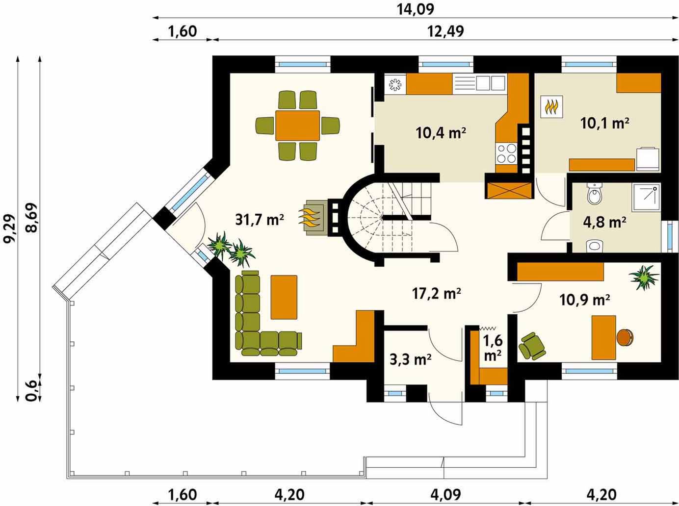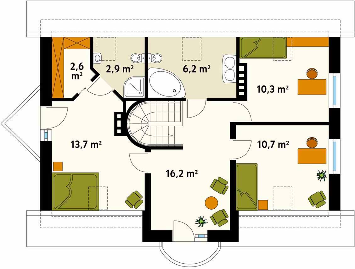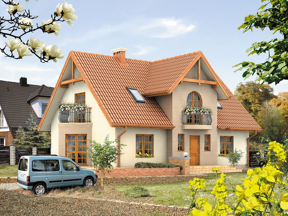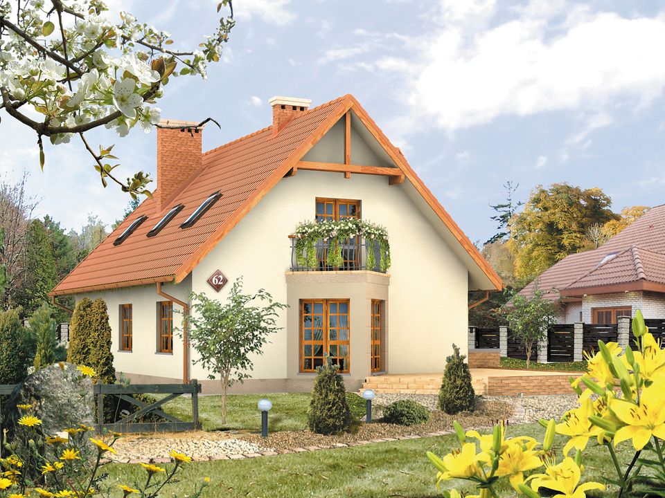 Graficzne opracowanie rzutów poglądowych widocznych na karcie projektu zostało wykonane przez Extradom.pl. Prezentowane przez Extradom.pl wizualizacje wykonane zostały przez autora projektu i należy poczytywać je jedynie za przykład i propozycję wykończenia, wizję architektoniczną autora projektu. Ostateczne wykończenie budynku może nastąpić na wiele sposobów. Szczegółowe rozwiązania zastosowane w oferowanej dokumentacji - w tym również ilość, lokalizacje i wygląd okien, drzwi, kominów - mogą w niewielkim stopniu różnić się od prezentowanej wizualizacji budynku.