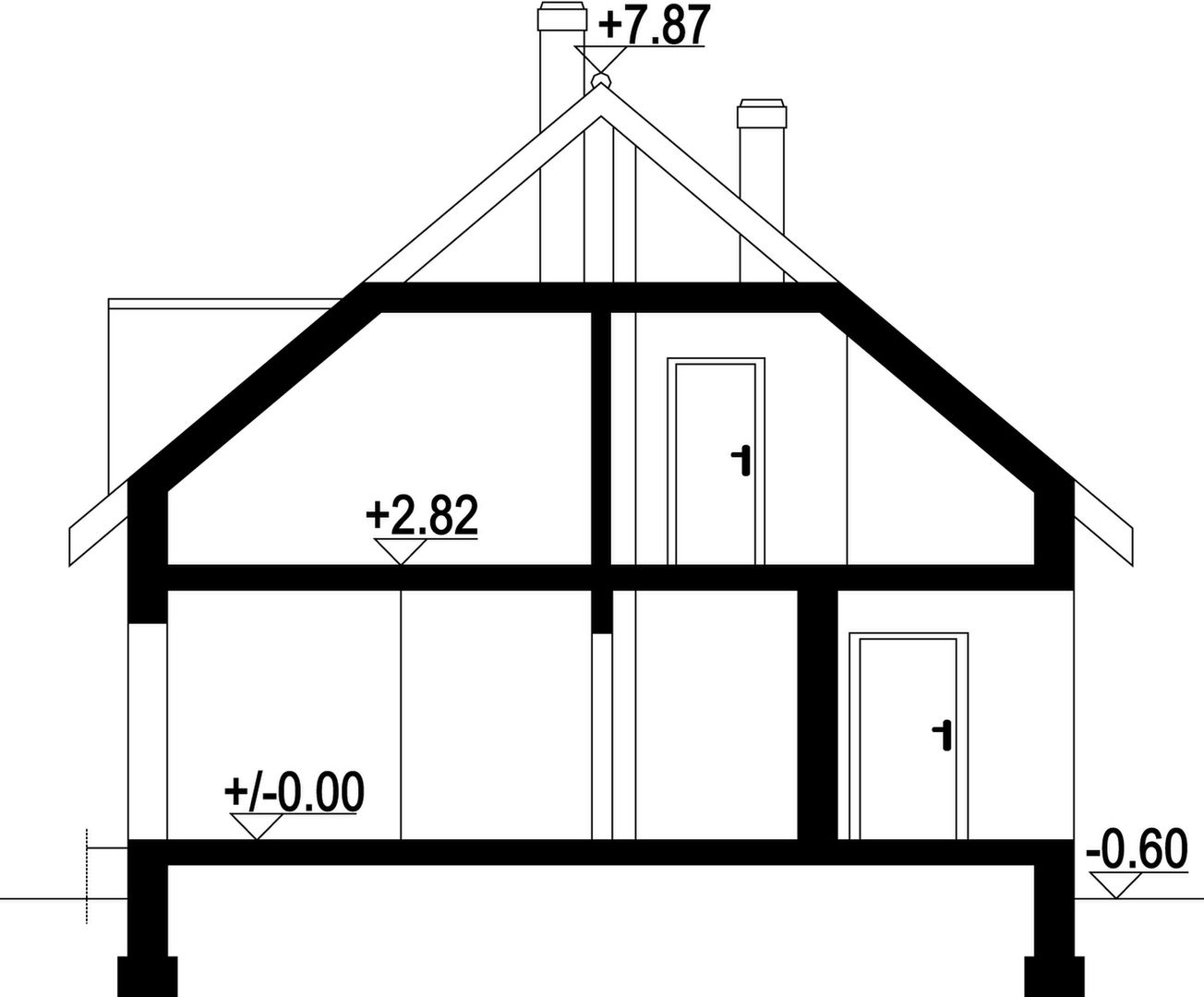 Wysokość ścianki kolankowej: 0.76 m. Strop: płyta żelbetowa. Pokrycie dachu: dachówka ceramiczna. Ściany zewnętrzne: pustaki ceramiczne + styropian. Ściany wewnętrzne: pustaki ceramiczne. Typ ogrzewania: kocioł gazowy lub kocioł na paliwo stałe. Inne: okna połaciowe Velux.